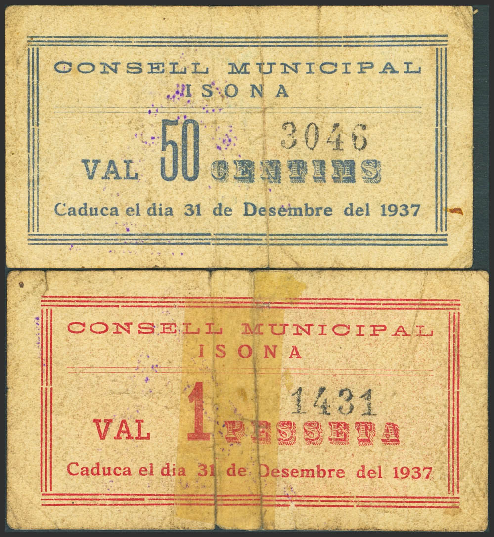 ISONA (LERIDA). 50 Cents and 1 Peseta. (1937ca). (González: 8263/64). Rare complete series. Fine.