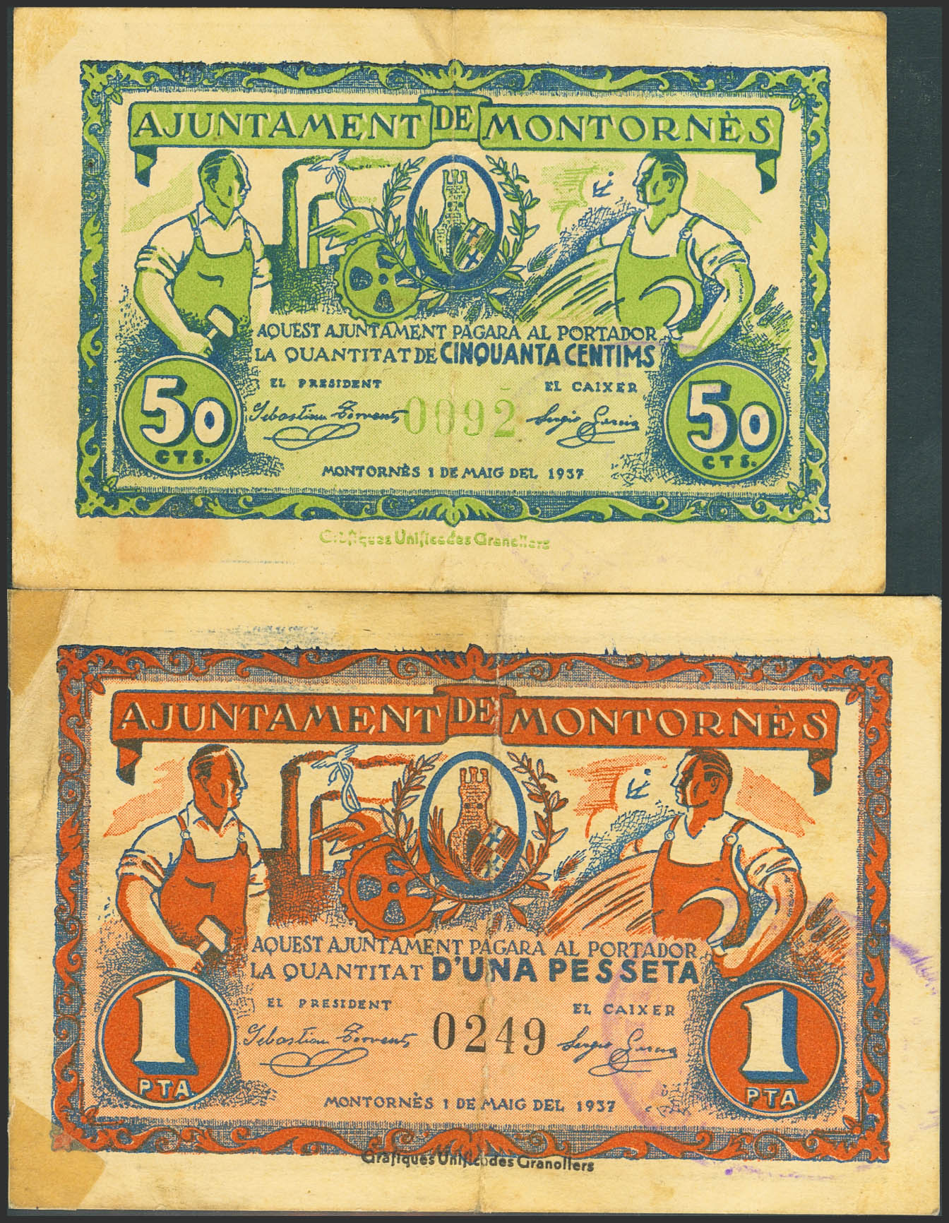 English MONTORNES (BAGoodELONA). 50 Cents and 1 Peseta. (1937ca). (González: 8808/09). Rare complete set. VF-.