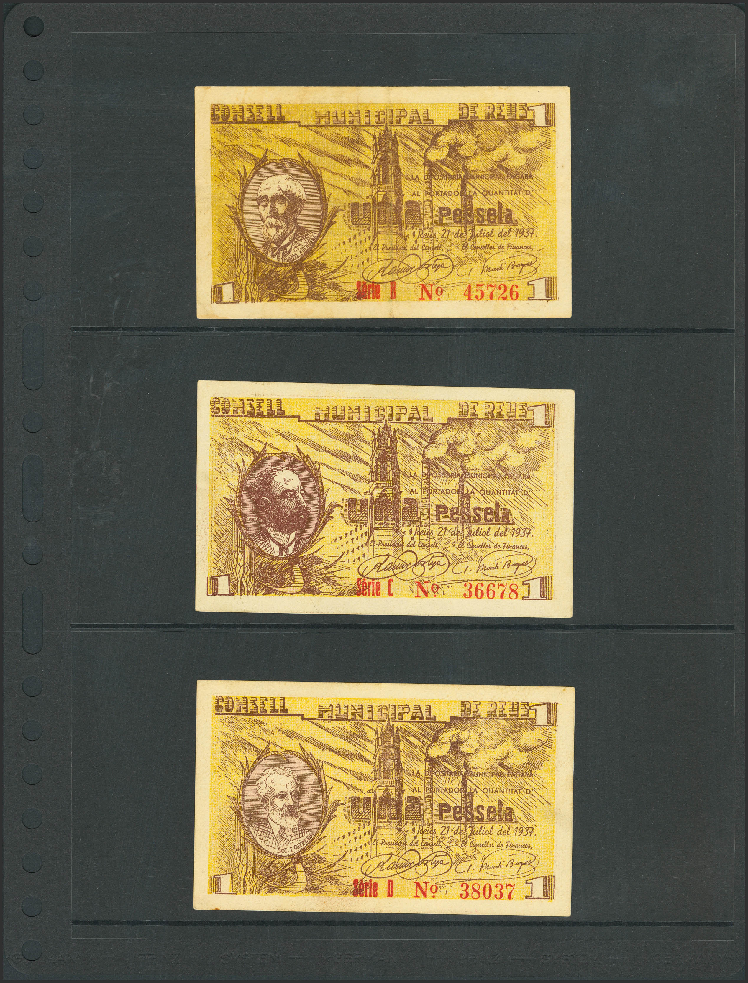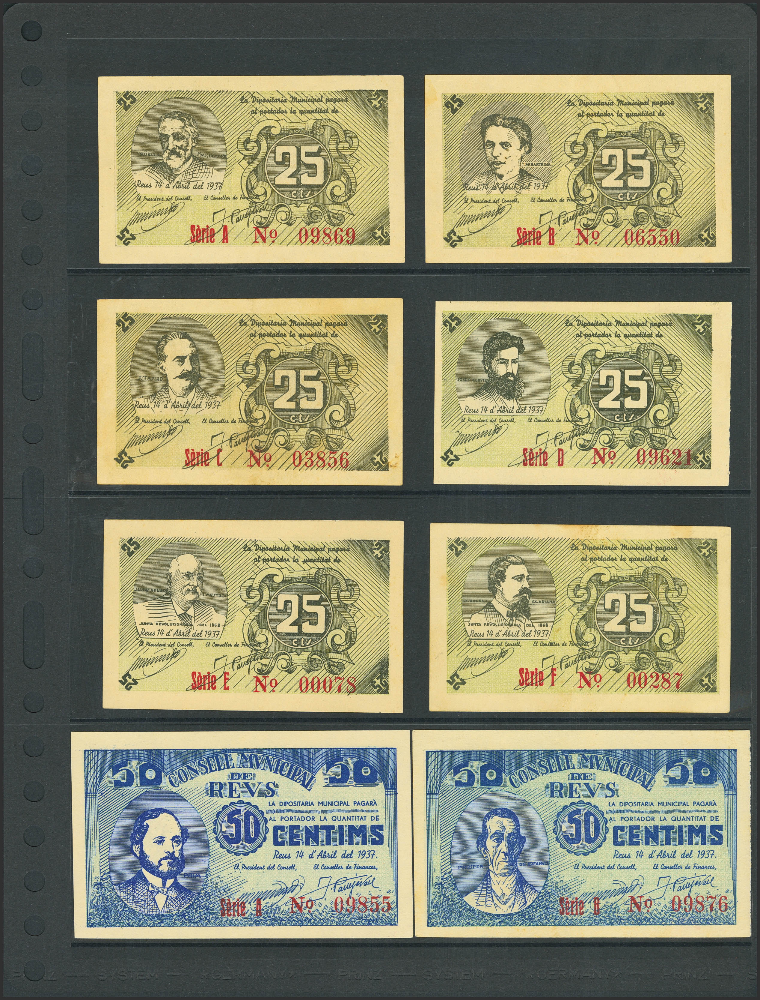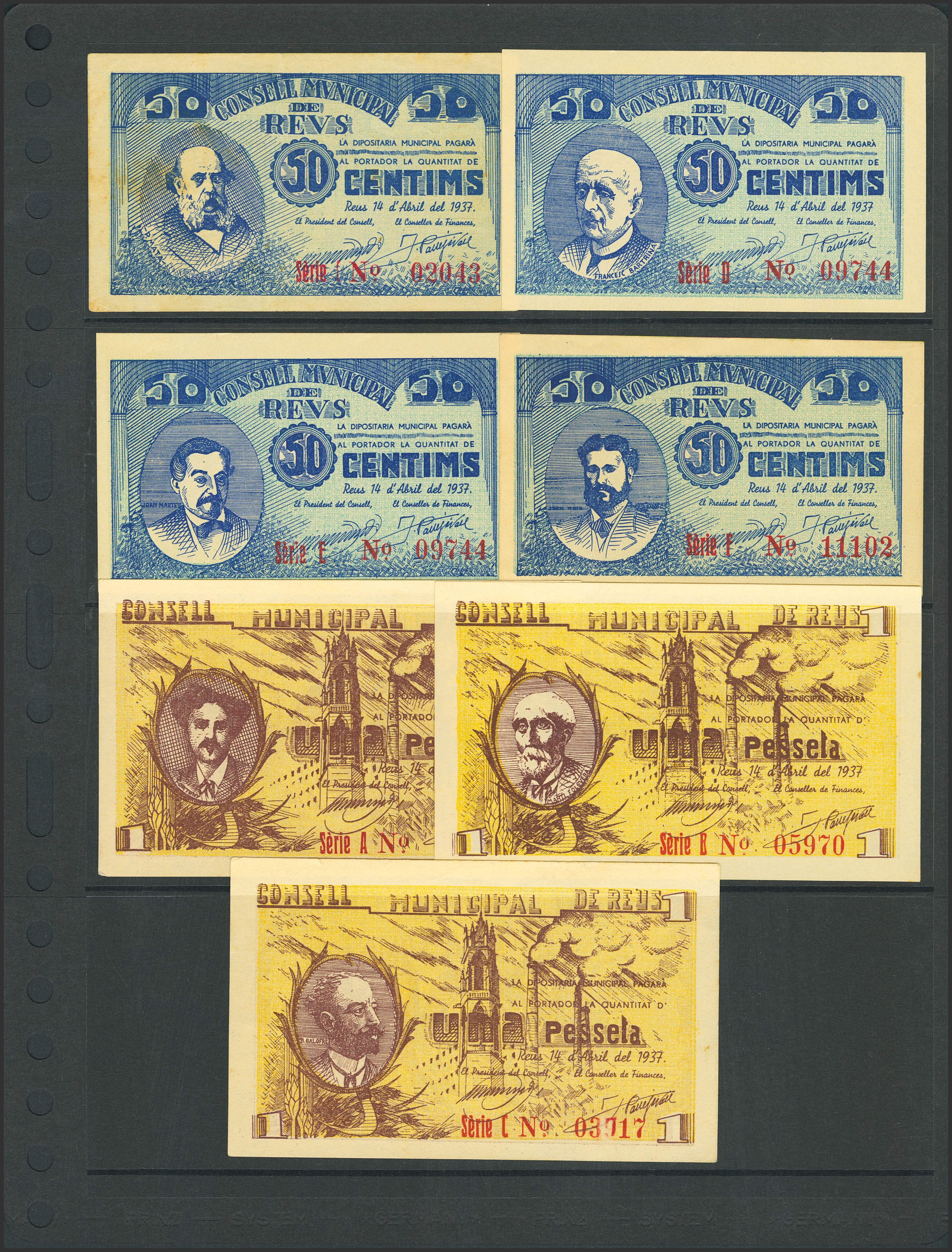 Complete Reus (Tarragona) set of 25 Cents with all A/F series, 6 50 Cents notes with all A/F series and 4 1 Peseta notes with all A/D series, issued on April 14, 1937, and also includes 3 1 Peseta notes with all B/D series, issued July 21, 1937 (Series B, VF+). (González: 9548/63, 9564/66). Very rare complete set, especially in this quality. UNC/Extremely Fine-.