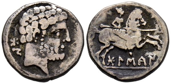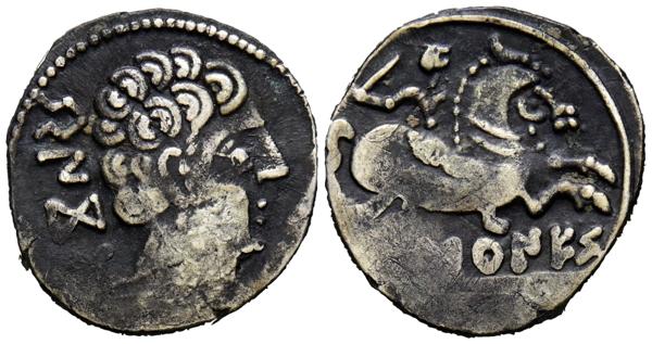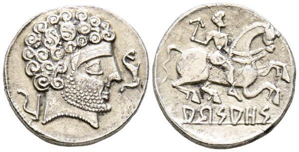 ARSAOS (Navarre area). Denarius. (Ar. 4.09g/19mm). 120-80 Fine (FAB-139). Obv: Bearded male head to right, dolphin in front, plough behind. Reverse: Horseman with dart to right, below Iberian legend above line: ARSAOS. Extremely Fine-. Beautiful, rare specimen. Ex Jesús Vico (06/08/2006), Lot No. 10.