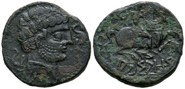 ARSAOS (Navarre area). As. (Ae. 7.67g/23mm). 120-80 Fine (FAB-144). Anv: Bearded male head to right, between two dolphins. Reverse: Horseman with dart to right, below Iberian legend: ARSAOS. VF-. Cleaned.