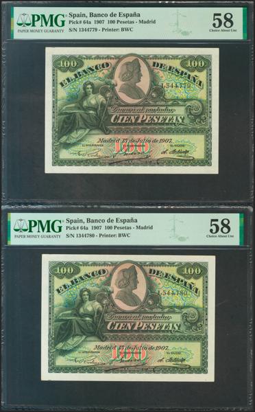 100 pesetas. July 15, 1907. Correlative couple. No serie. (Edifil 2021: 320, Pick: 64a). Rare, especially in this quality. EBC++/ Good Extremely Fine. PMG58/55 encapsulation.