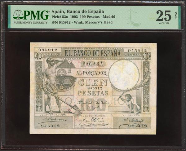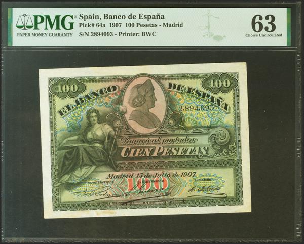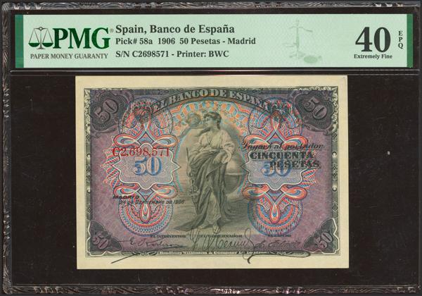 100 Pesetas. June 30, 1906. Series B. (Edifil 2023: 313a, Pick: 59a). Original size. Good Extremely Fine+. Packaged in PMG55EPQ.