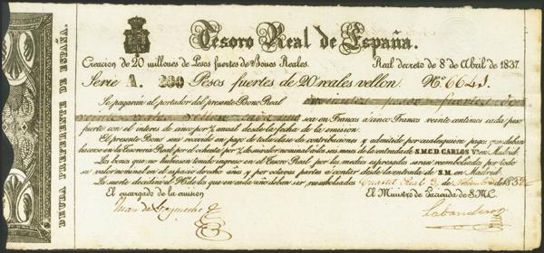 50 Pesos Fuertes of 20 Reales de Vellón. Royal Treasury of Spain. April 8, 1837. Series C and die on the left. (Edifil 2023: 21). Very rare, especially with the die. Unused.