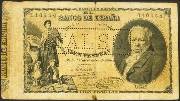 100 Pesetas. 1 de Octubre de 1886. Sin serie. (Edifil 2023: 294, Pick: 36). Muy raro, reparado y pequeñas roturitas. MBC-.