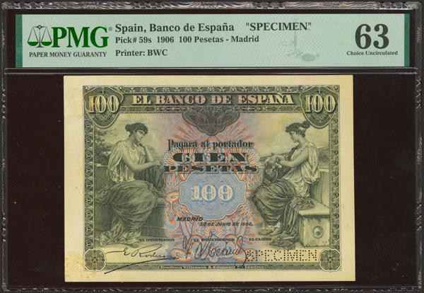 100 Pesetas. 24 de Septiembre de 1906. SPECIMEN taladrado, sin numeración y sin firmas. (Edifil 2023: 313M, Pick: 59s). SC. Encapsulado PMG63 (previously mounted).