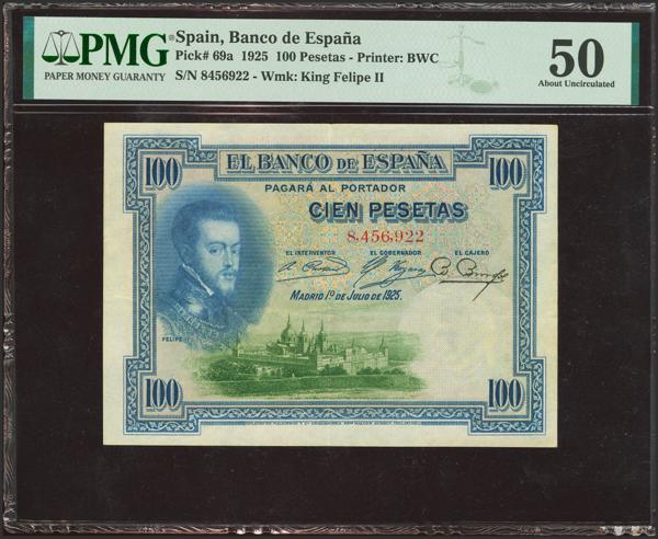 25 Pesetas. October 12, 1926. Series B, last series issued. (Edifil 2021: 325a, Pick: 71a). Unusual in this quality. Good Extremely Fine. PMG55 encapsulation.