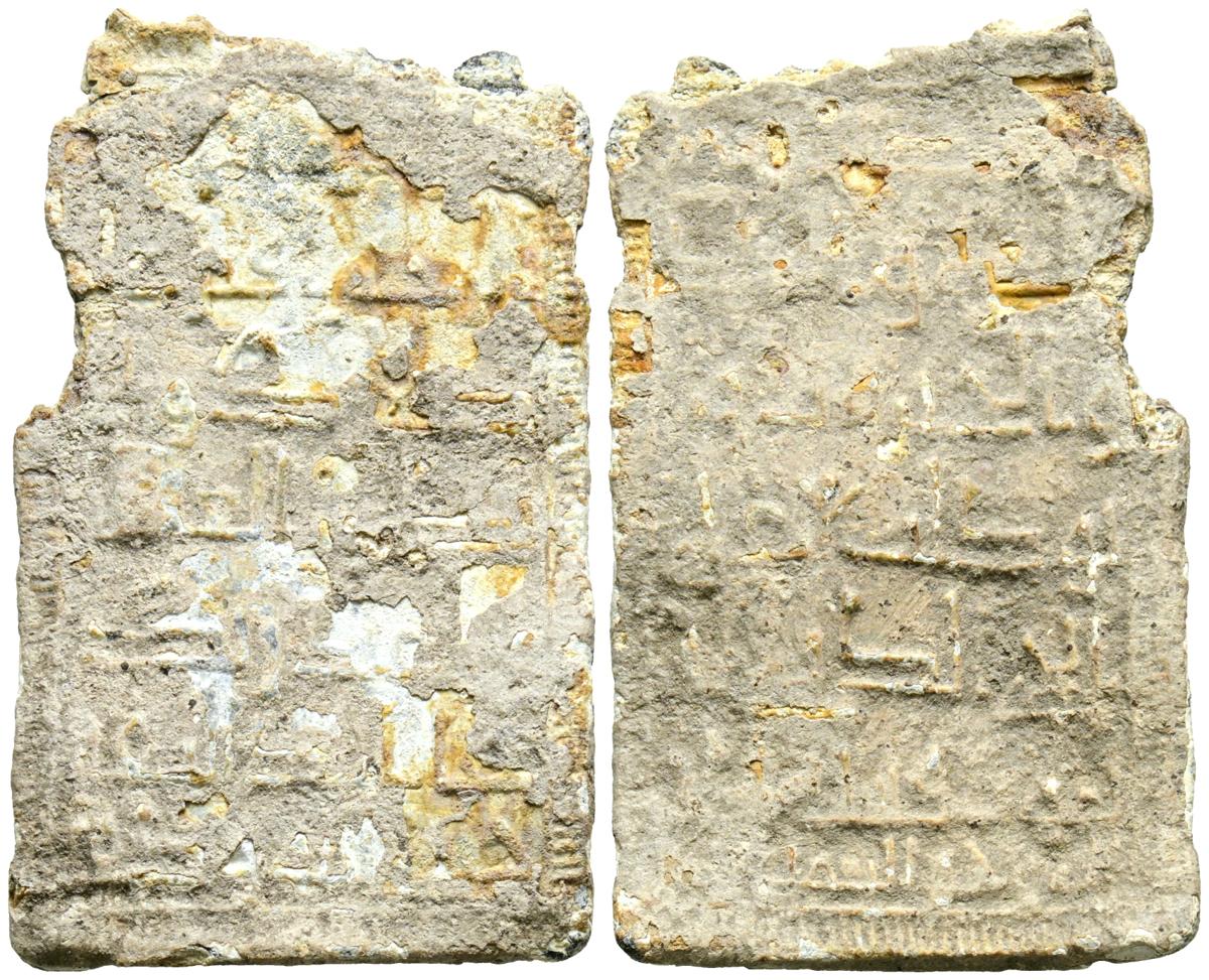 CALIFAL OR TAIFAS PERIOD. Rectangular amulet. (Pb. 7.85g/39x24mm). Possibly 10th-11th century. Rectangular lead plate with no signs of having been bent. In both areas, framed by a narrow band in which a scratch motif is repeated, seven lines of Quranic text in elegant Kufic script, with the tall letters finished in a bevel. Antv: عْبُدْ رَبَّكَ / حتّى ياتيك اليقين / حسبي ألله و كفل and do not/be one of the careless/and worship your Lord/until death comes to you./God is enough for me and keeps me). Rev: وت و سيكفيكهم / أللهُ وَ هُوَ السَّمِيعُ الع َليمُ (I fortify myself in him who has/glory, and majesty,/and omnipotence and/I trust in the/Alive that does not/die. It will be enough for you against them/God, He is the one who hears everything, the one who knows everything). (Amulets 370-N14. Type A-IV, same specimen). Almost Very Fine.
