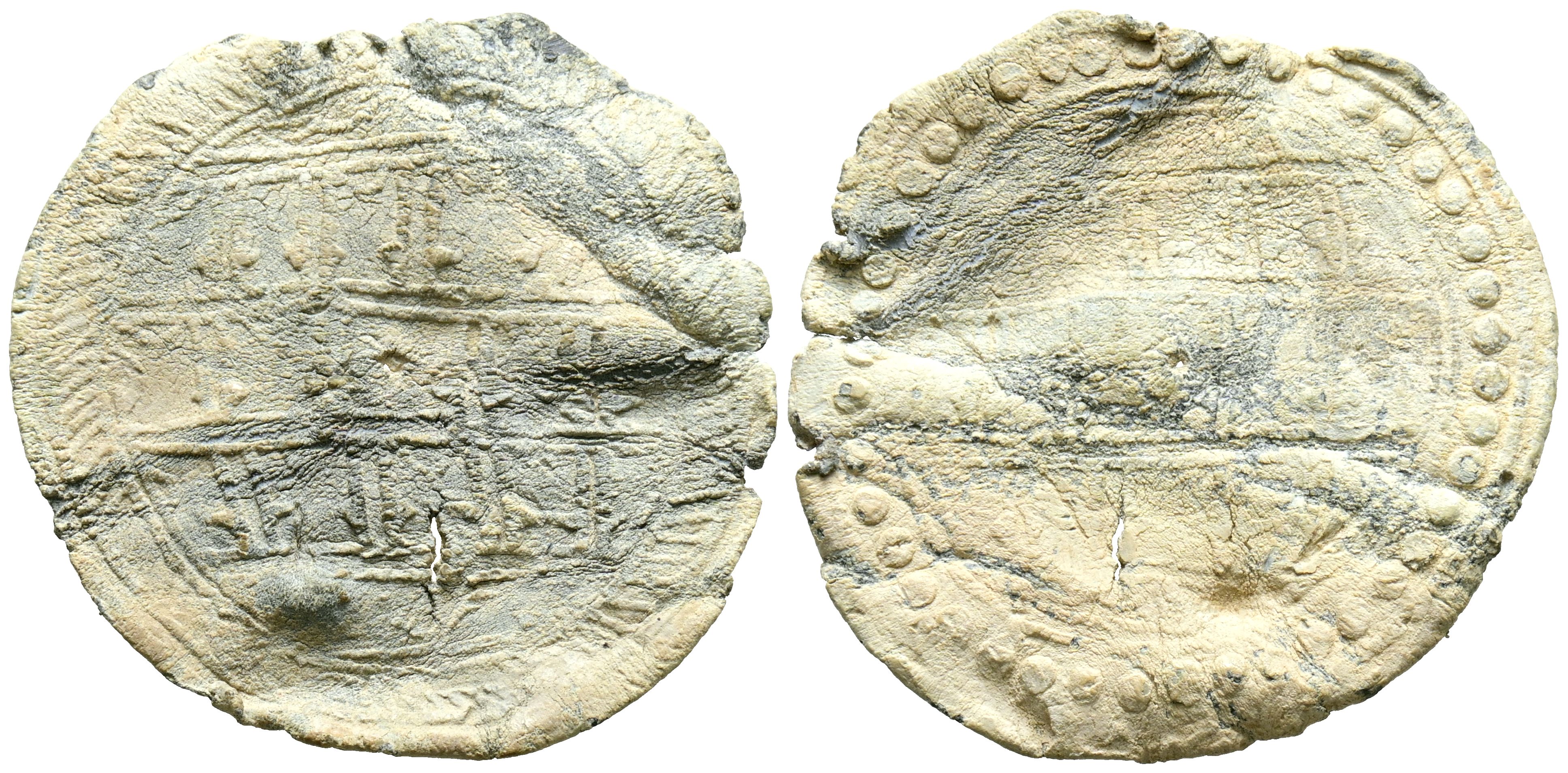 English CALIFAL PERIOD. Monetiform amulet. (Pb. 3.67g/27mm). Possibly 10th century. In both areas, three lines of linear Kufic writing, with the stems of the long letters finished with a bevel. The legends are a succession of the letters "lam" and "alif" with some letters between them, which must form a kind of litany, possibly of a magical nature. The only visible difference between both areas is the external circular band, which on the obverse contains a motif of dots and on the reverse a motif of small oblique scratch . (Amulets 356-N10. Type B-III, same specimen). Very Fine.