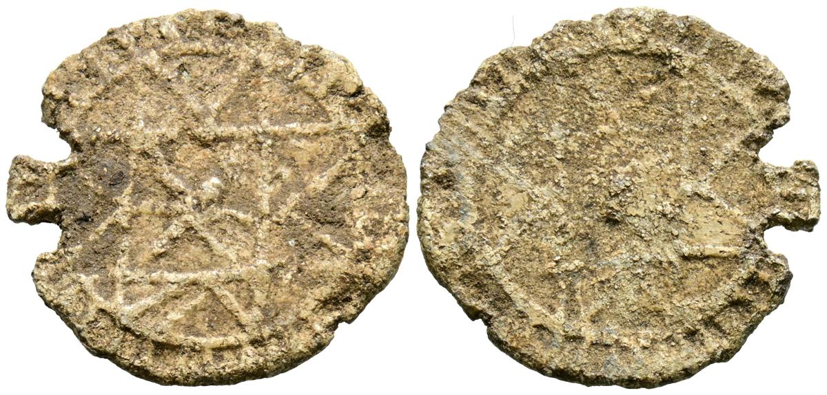 CALIFAL/TAIFAS PERIOD. Monetiform amulet. (Pb. 4.69g/22mm). The same in both areas, a border of radial lines runs along the entire edge, and in the center an eight-pointed star. The piece has two perforations with breaks on the edge that were possibly made to use it as a pendant. (Similar to obverse Amulets 128. Type B-IV). Very Fine.