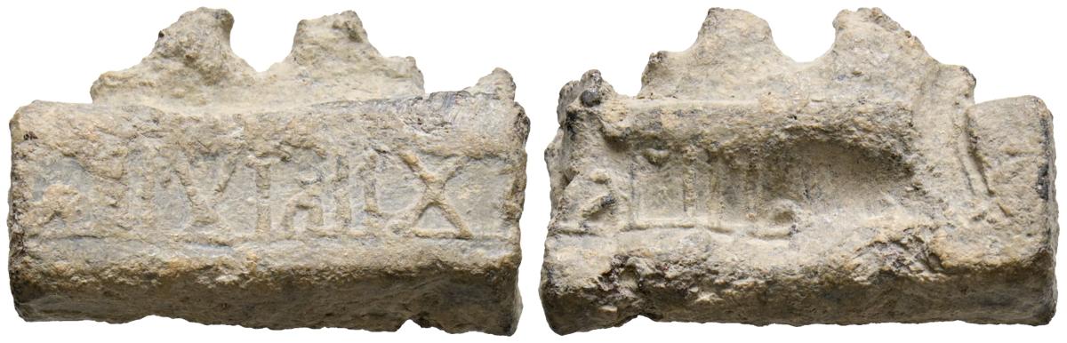 ALMOHADE PERIOD. Amulet-case. (Pb. 11.08g/25x16X7mm). Possibly 13th-14th century. Tube-shaped lead case with remains of three fastening rings at the top. The piece presents ornamental Kufic writing, with graceful strokes with simple arrow endings. Anv: لا إله إلّا ألله (There is no god but God). Rev: Despite having the first part of the legend practically erased, its reading is clear: (Ù…ØÙ…د رس)ول ألله (Muhammad is the Messenger of God). (Similar to Amulets 234. Type B-Three-handled tubes). Very Fine.