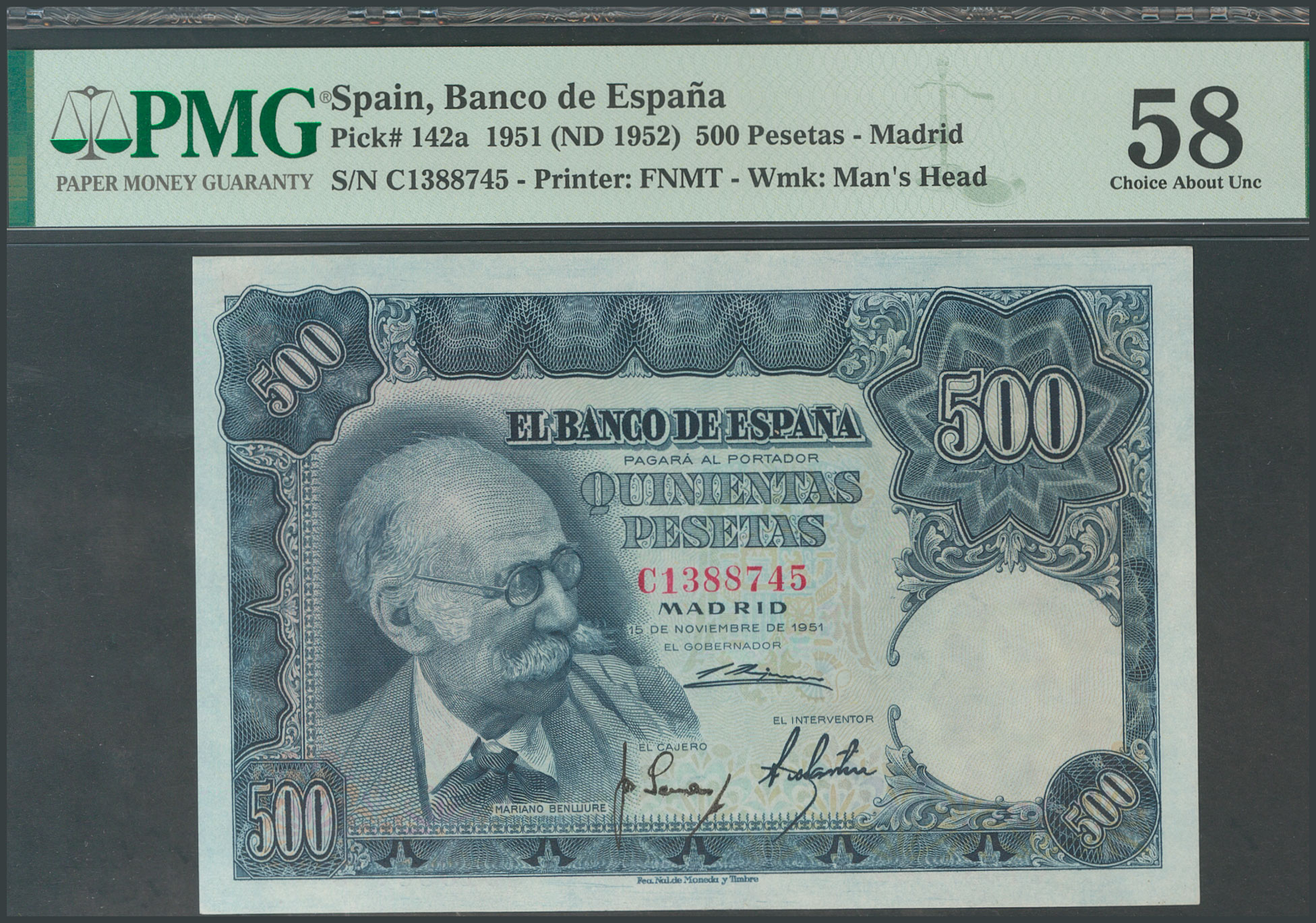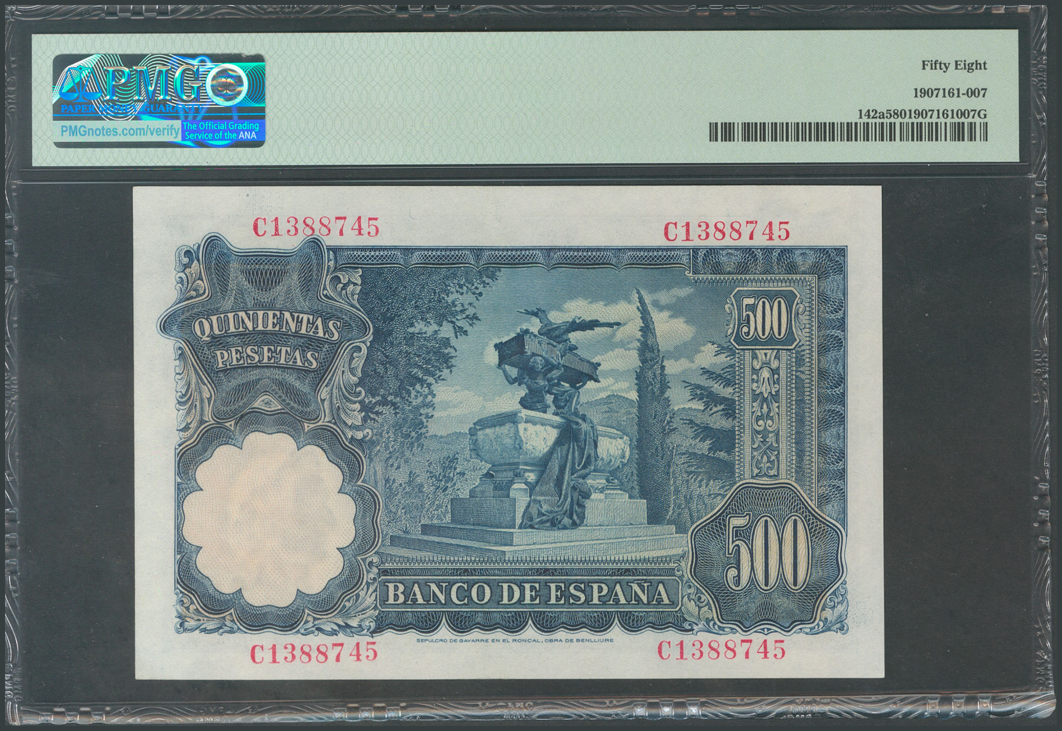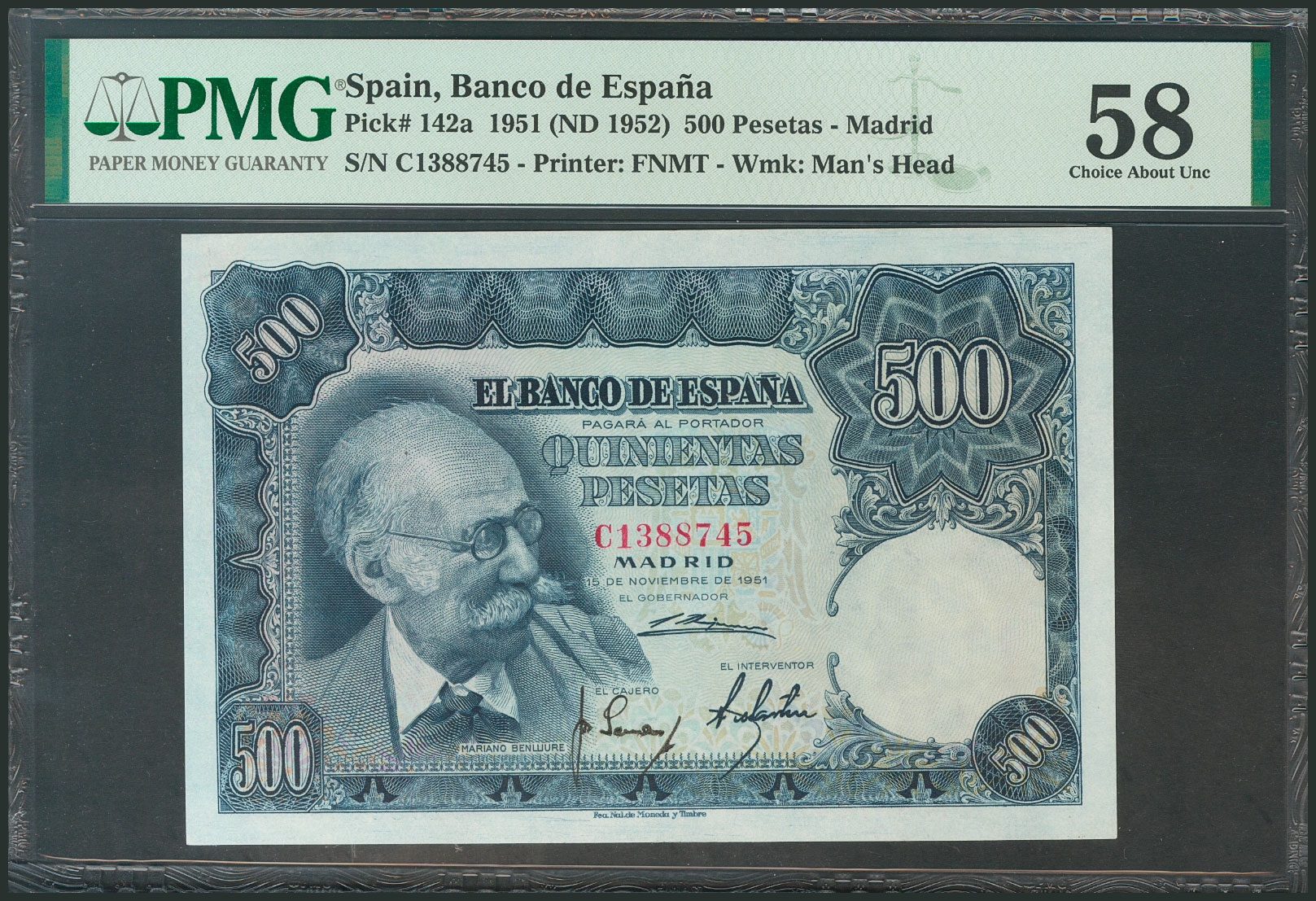 500 pesetas. November 15, 1951. Series C, last series issued. (Edifil 2017: 460a). Good Extremely Fine. PMG58 encapsulation.
