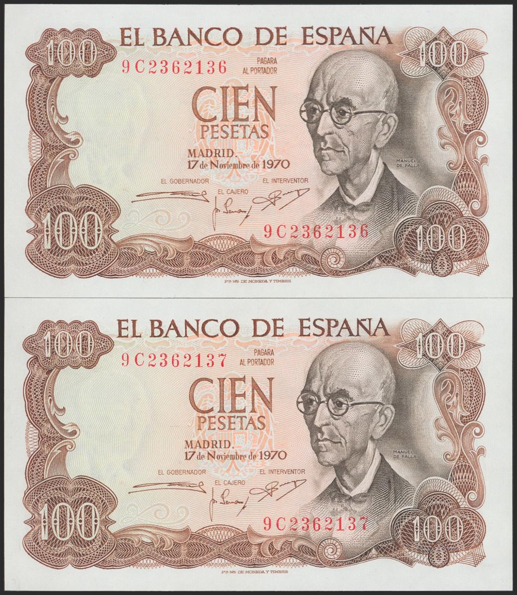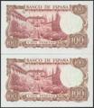 100 Pesetas. November 17, 1970. Consecutive pair. Series 9C, special series. (Edifil 2017: 472d). Uncirculated/Uncirculated-.