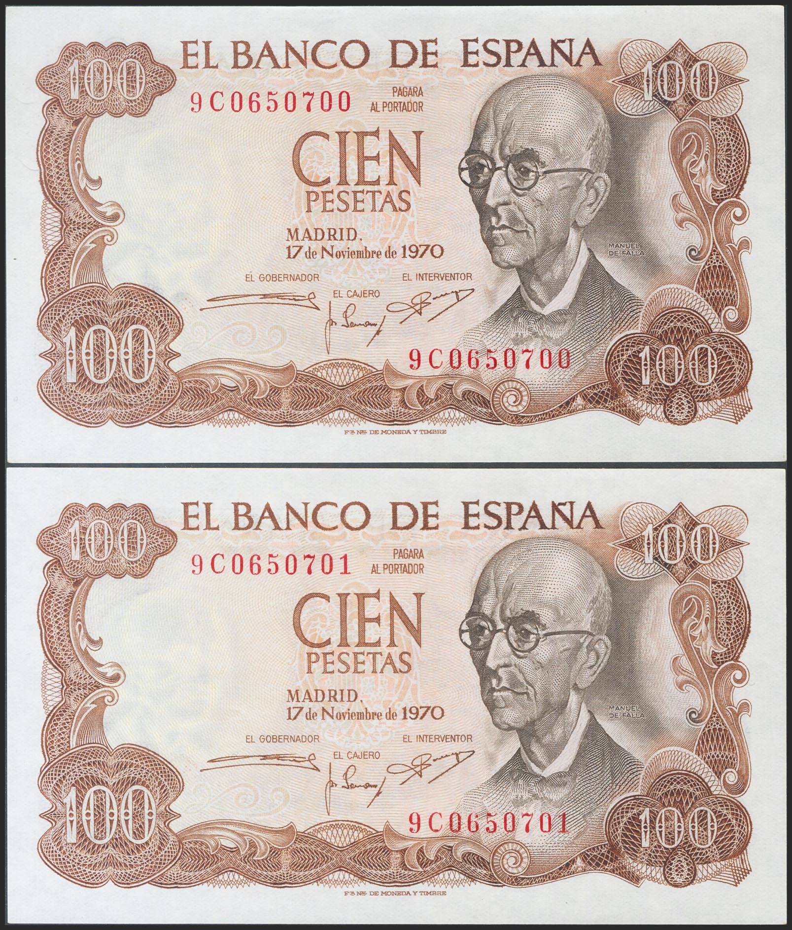 100 pesetas. November 17, 1970. Correlative couple. 9C series. (Edifil 2017: 472d). Original sizing. Uncirculated.