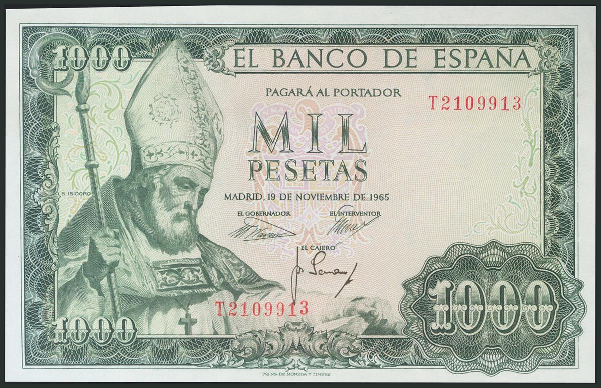 1000 Pesetas. November 19, 1965. Series T. (Edifil 2017: 471b). It retains all its original sizing. Almost Uncirculated.