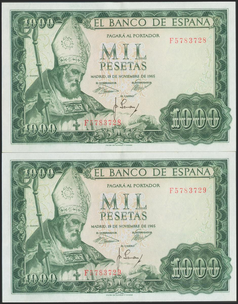 1000 Pesetas. November 19, 1965. Correlative couple. Series F. (Edifil 2017: 471b). Good Extremely Fine.