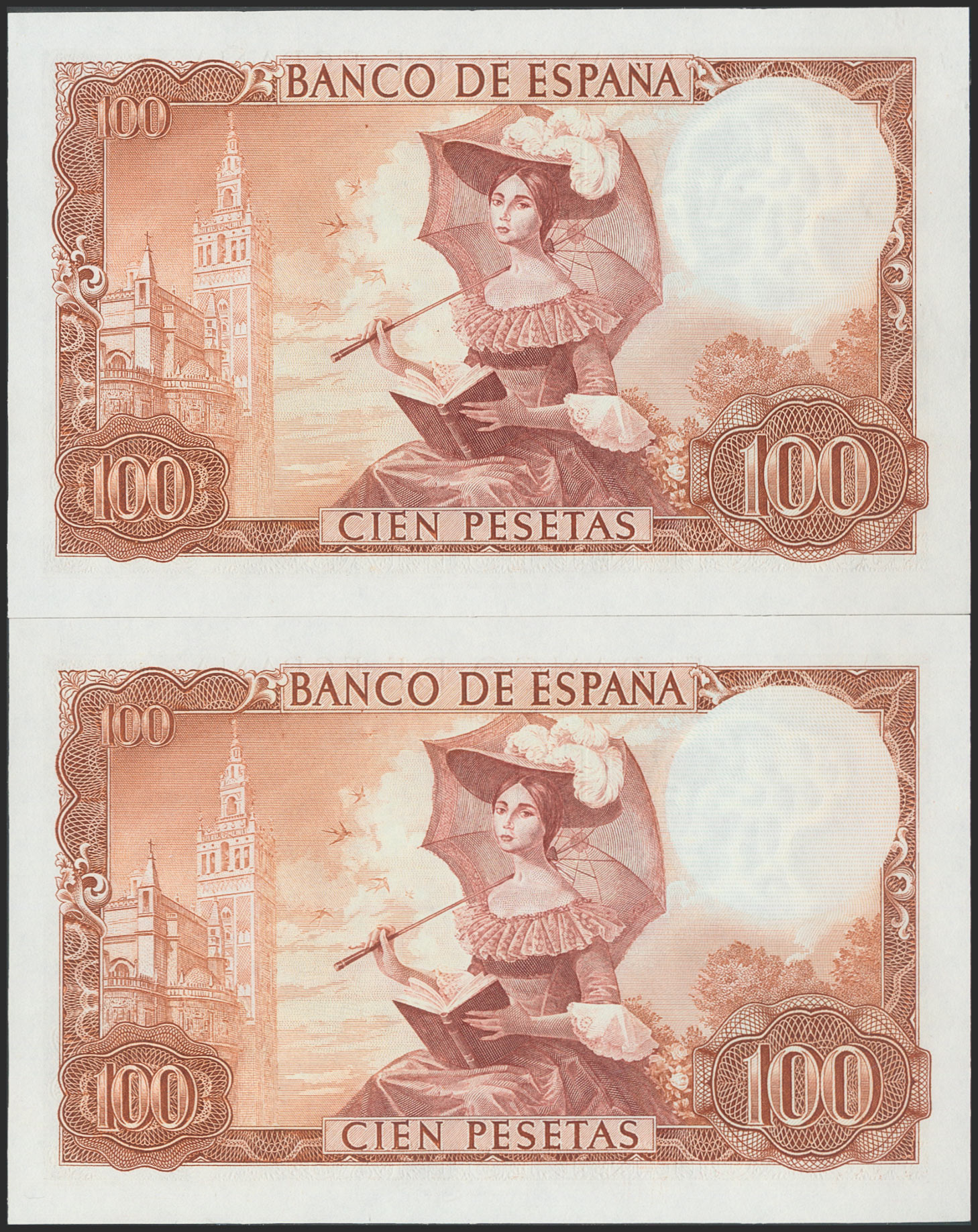 100 pesetas. November 19, 1965. Correlative couple. No serie. (Edifil 2017: 470a). Uncirculated/ Almost Uncirculated.