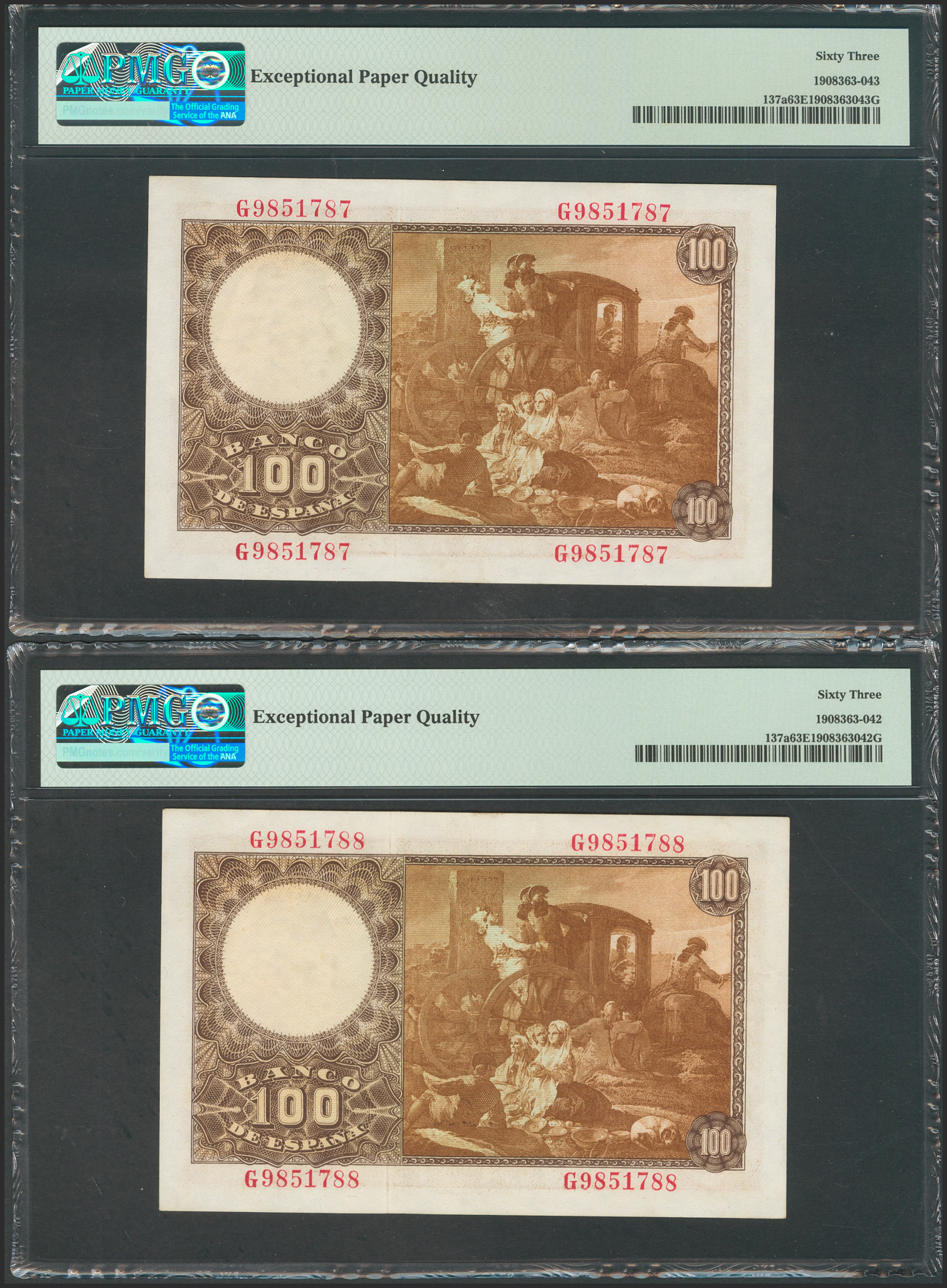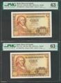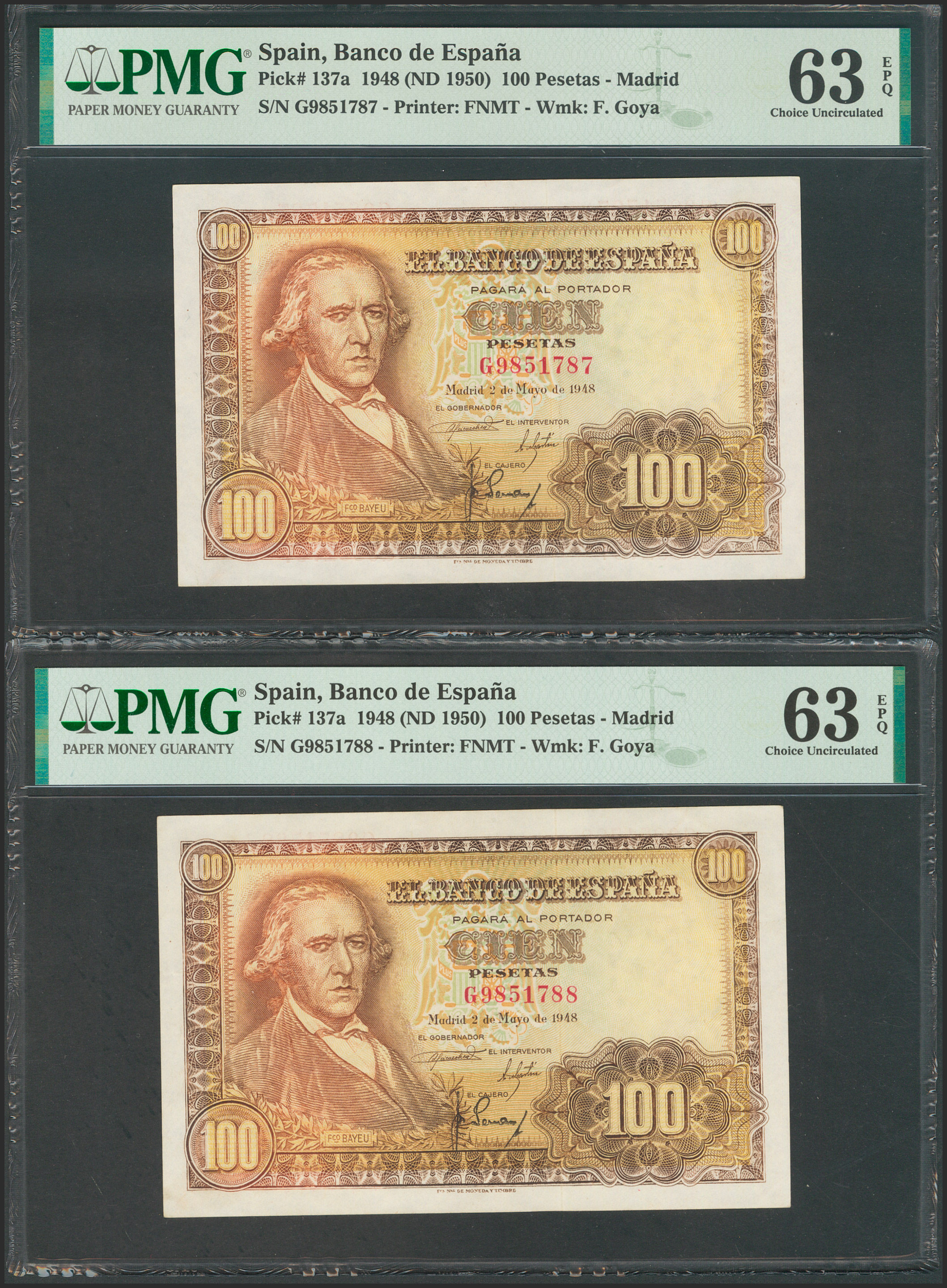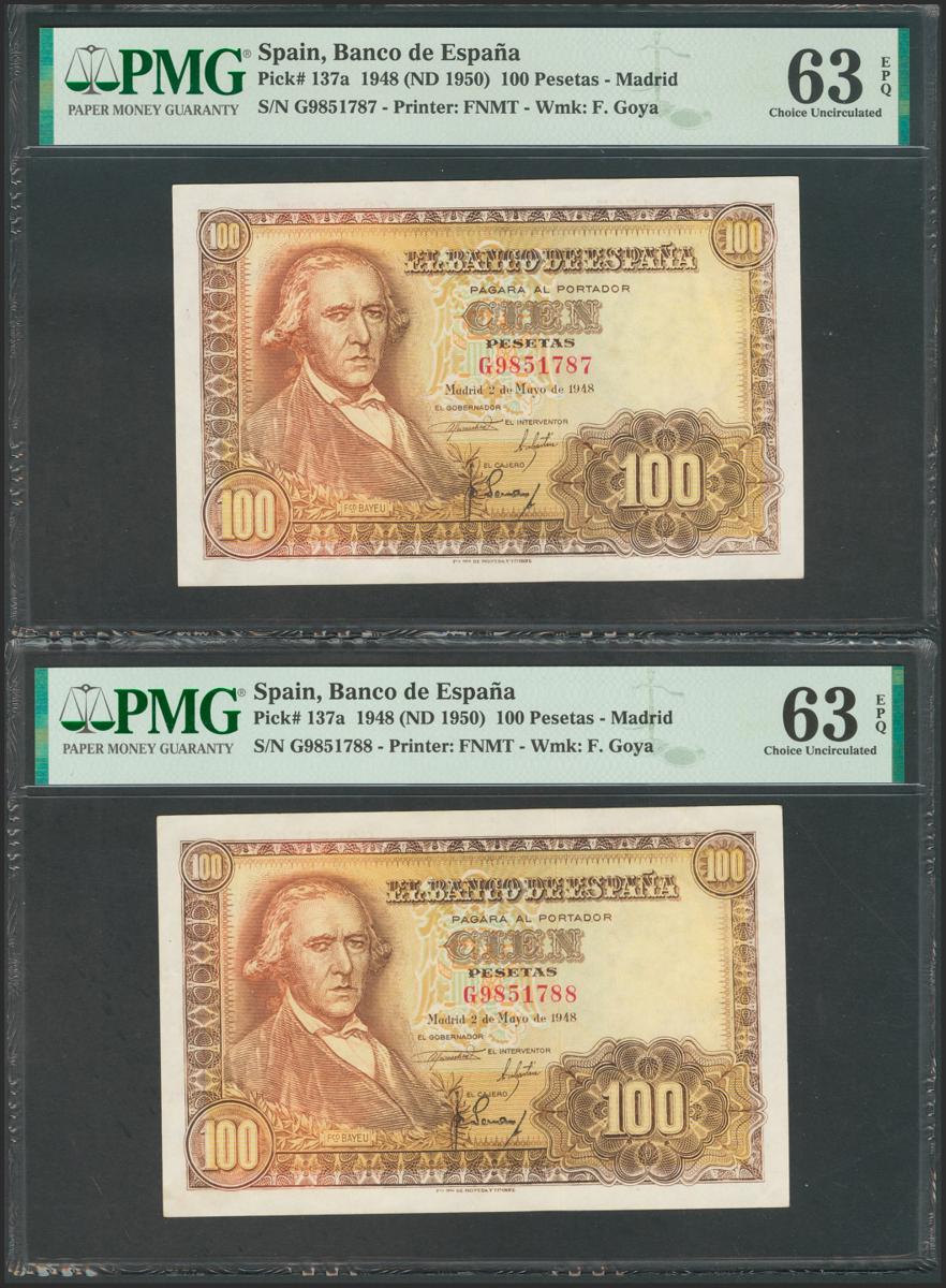 100 pesetas. May 2, 1948. Correlative couple. Series G. (Edifil 2017: 456a). Original sizing. Uncirculated. PMG63EPQ packages, both.
