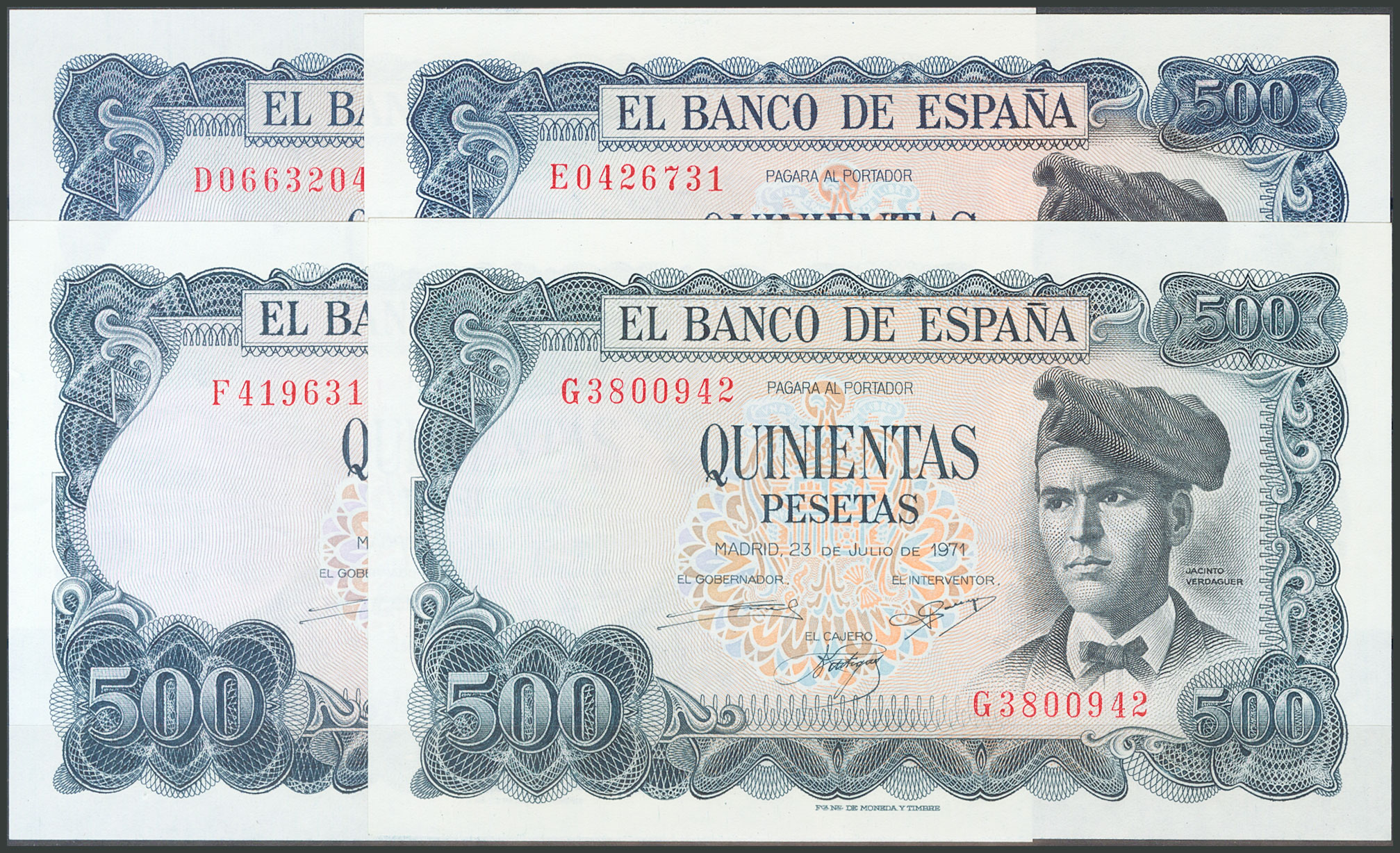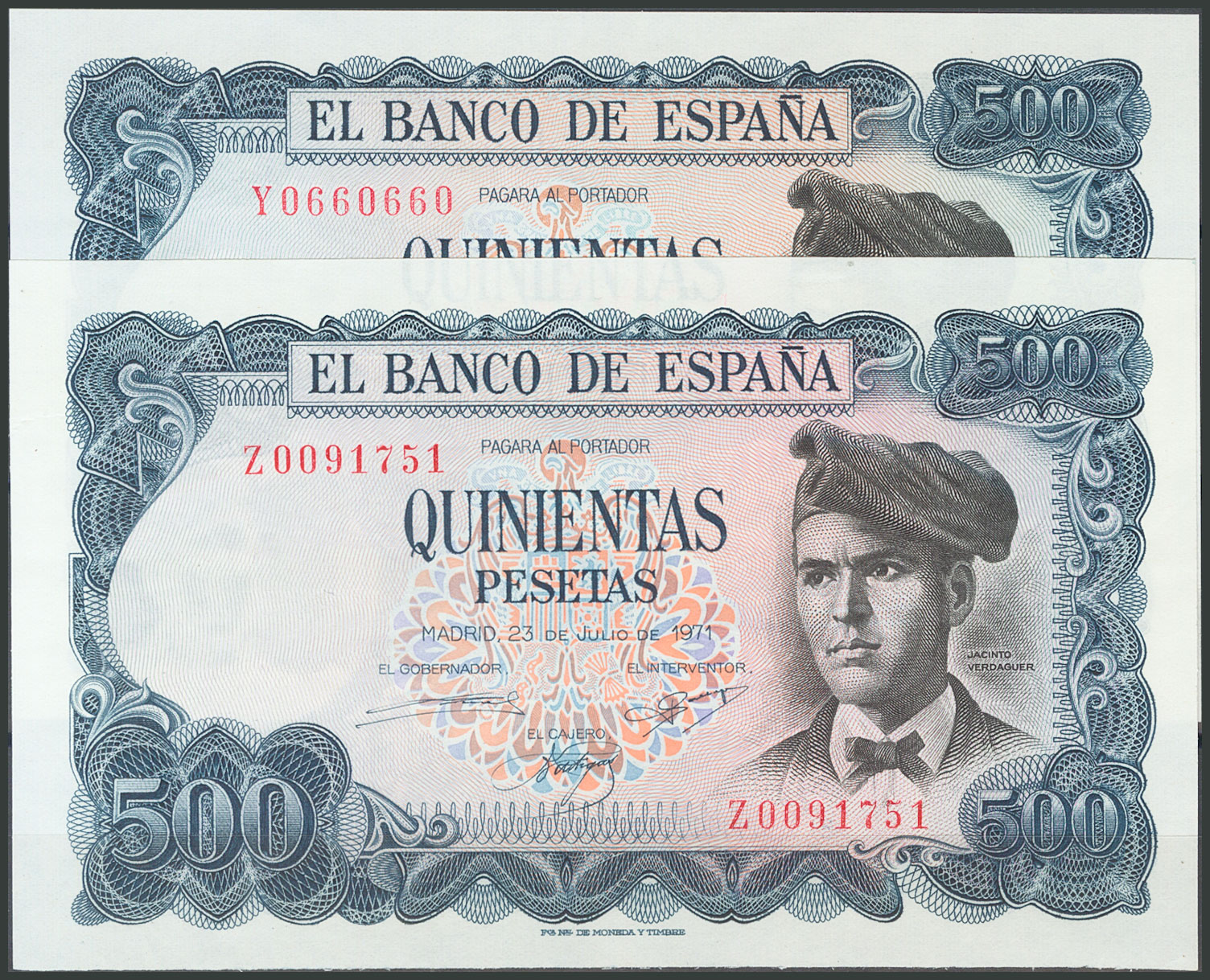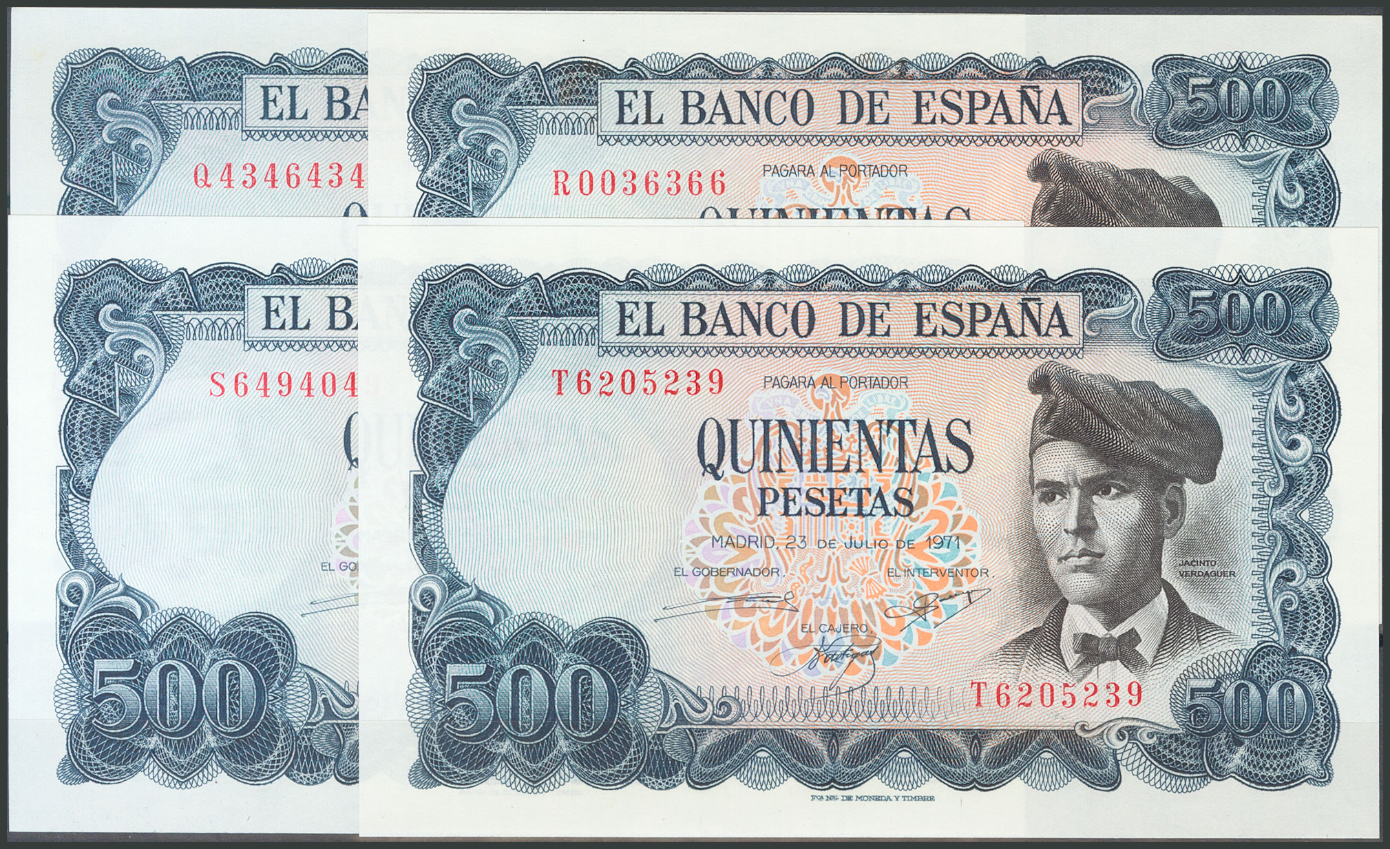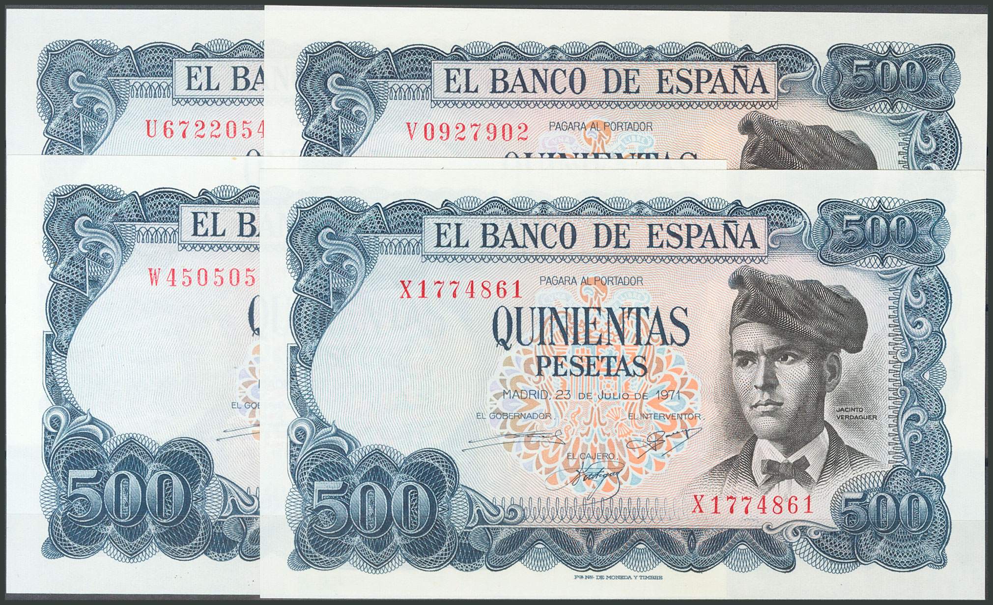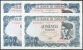Beautiful and interesting set of 26 500 Peseta bills issued on July 23, 1971, including all the letters and the one without a capicúa series from the first issue (A, B, C, D, E, F, G, H, I, J, K, L, M capicúa, N, P, Q capicúa, R, S, T, U, V, W capicúa, X, Y capicúa and Z). (Edifil 2017; 473, 473a). Very rare set and very good quality. All banknotes have original sizing. Uncirculated/ Almost Uncirculated.