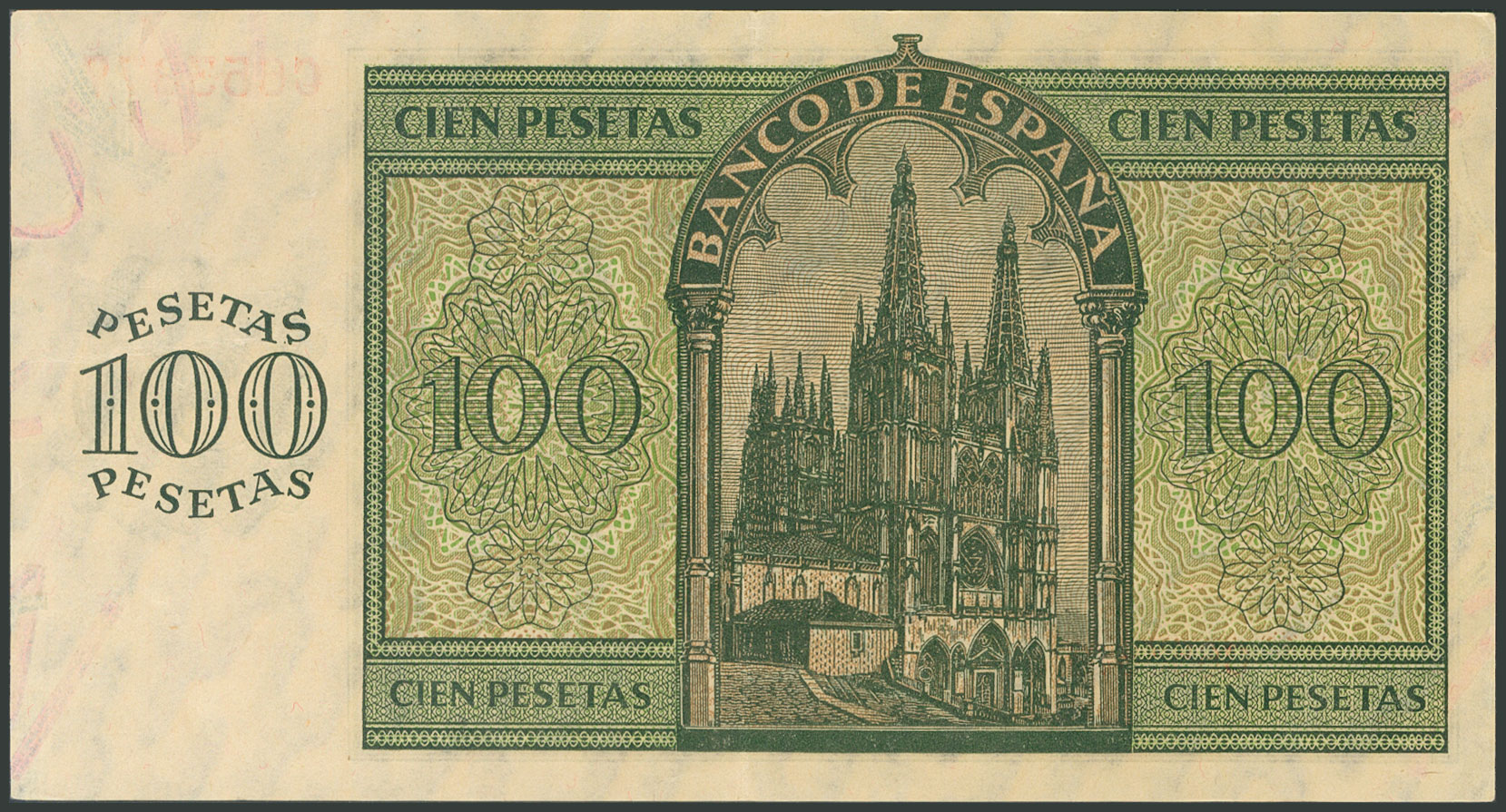 100 pesetas. November 21, 1936. Series C. (Edifil 2017: 421a). Retains its original sizing. Extremely Fine.