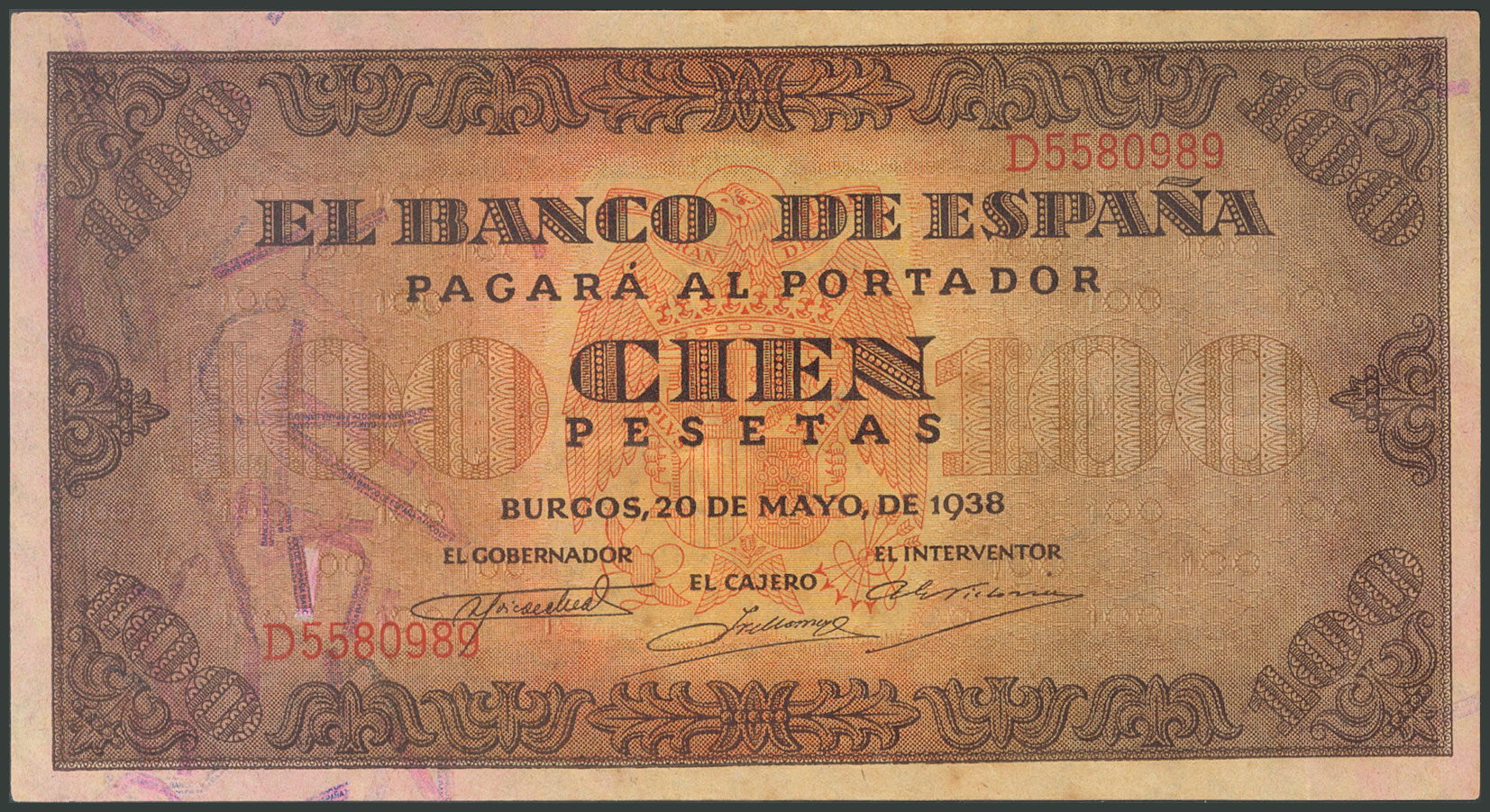 English 100 pesetas. May 20, 1938. Series D. (Edifil 2017: 432a). Retains much of the original sizing. Extremely Fine.