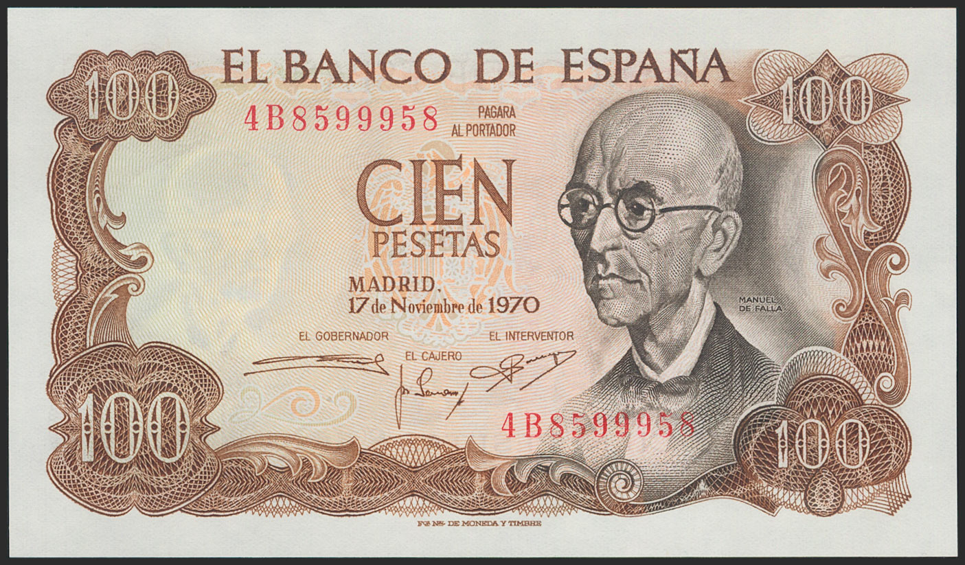 100 Pesetas. November 17, 1970. Series 4B and palindromic numbering. (Edifil 2017: 472c). Uncirculated.