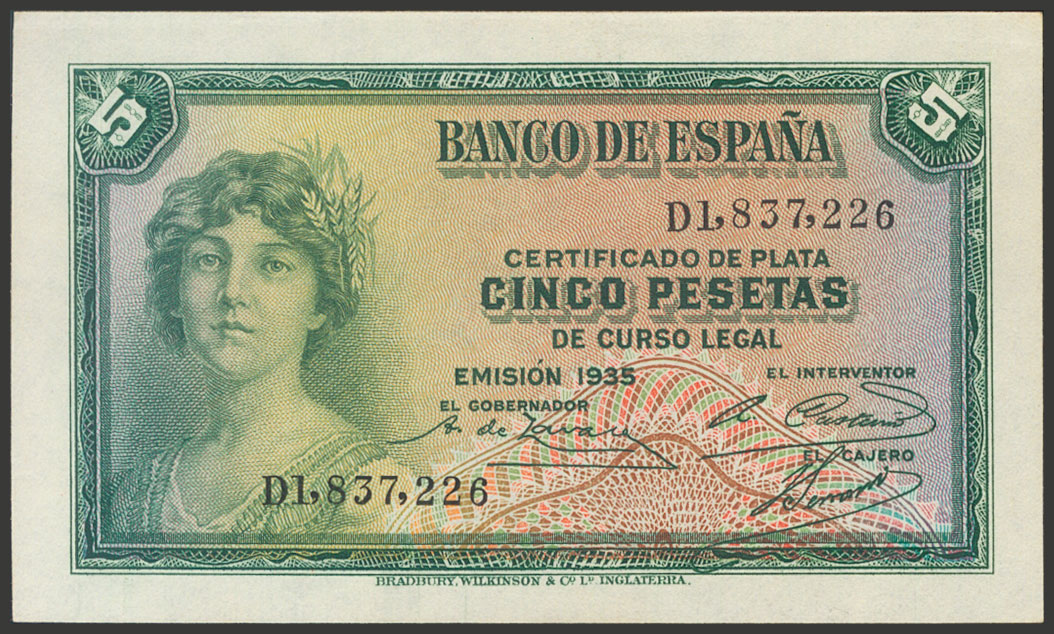 5 pesetas. 1935. Series D. (Edifil 2017: 363a). Almost Uncirculated.