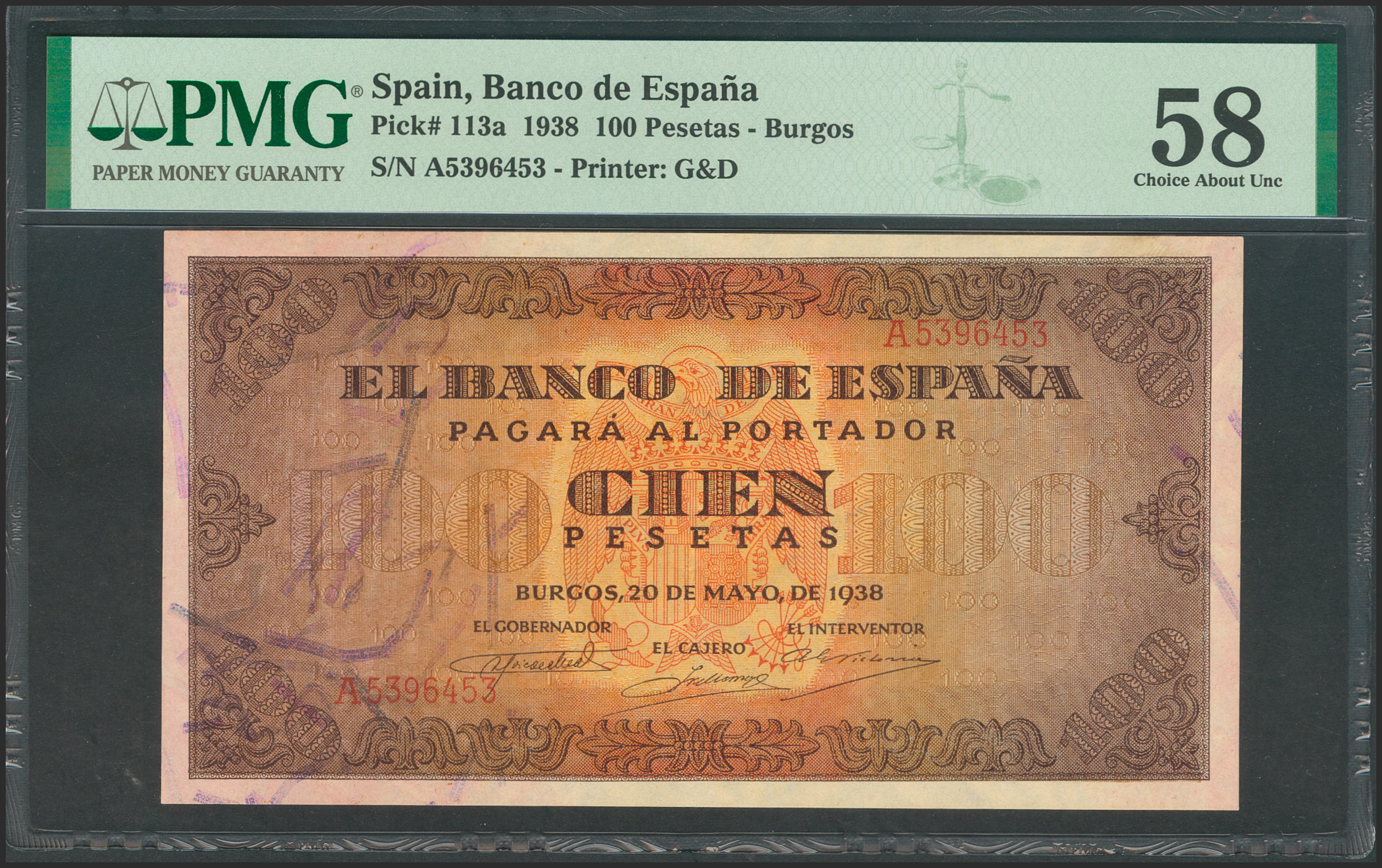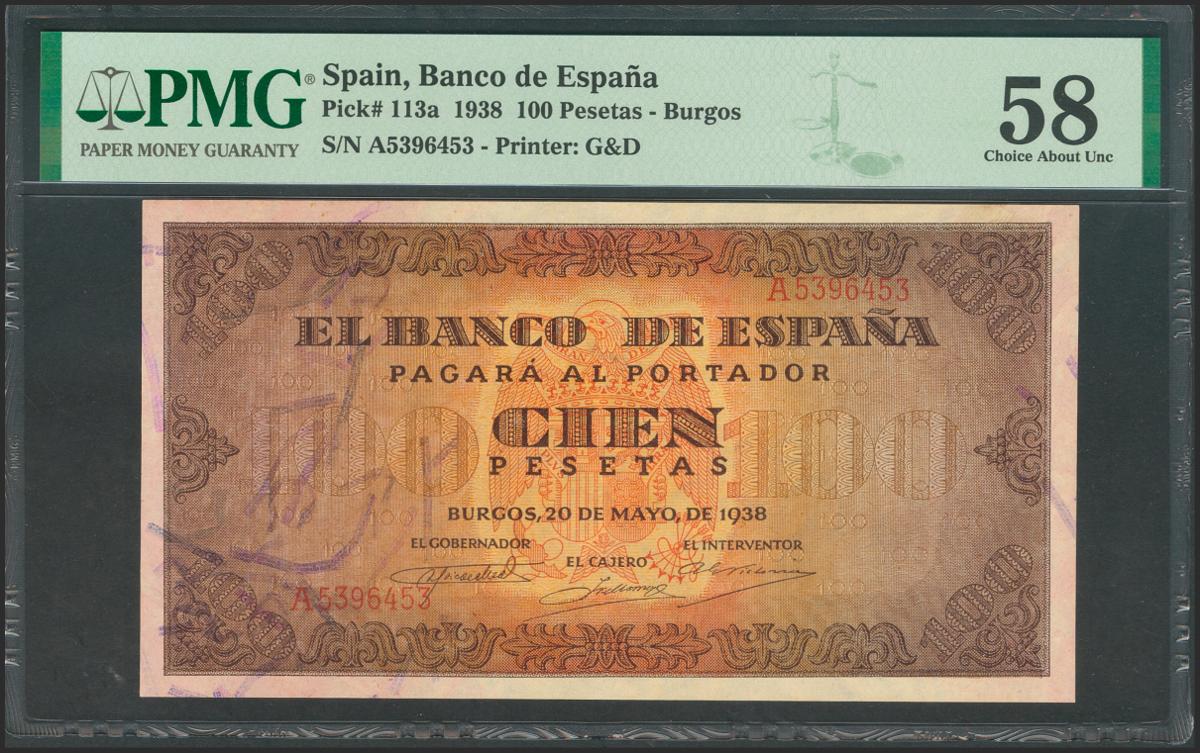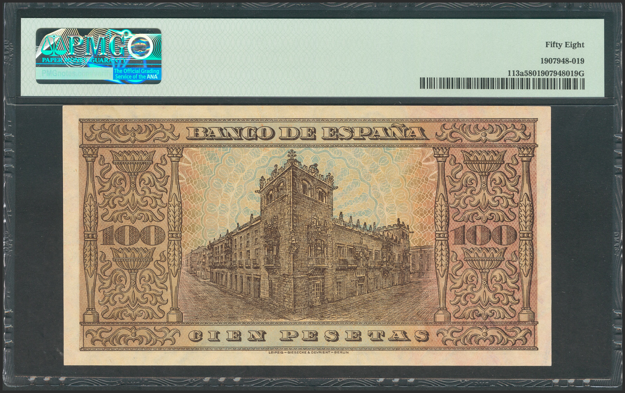 100 pesetas. May 20, 1938. Series A. (Edifil 2017: 432). Good Extremely Fine. PMG58 encapsulation.