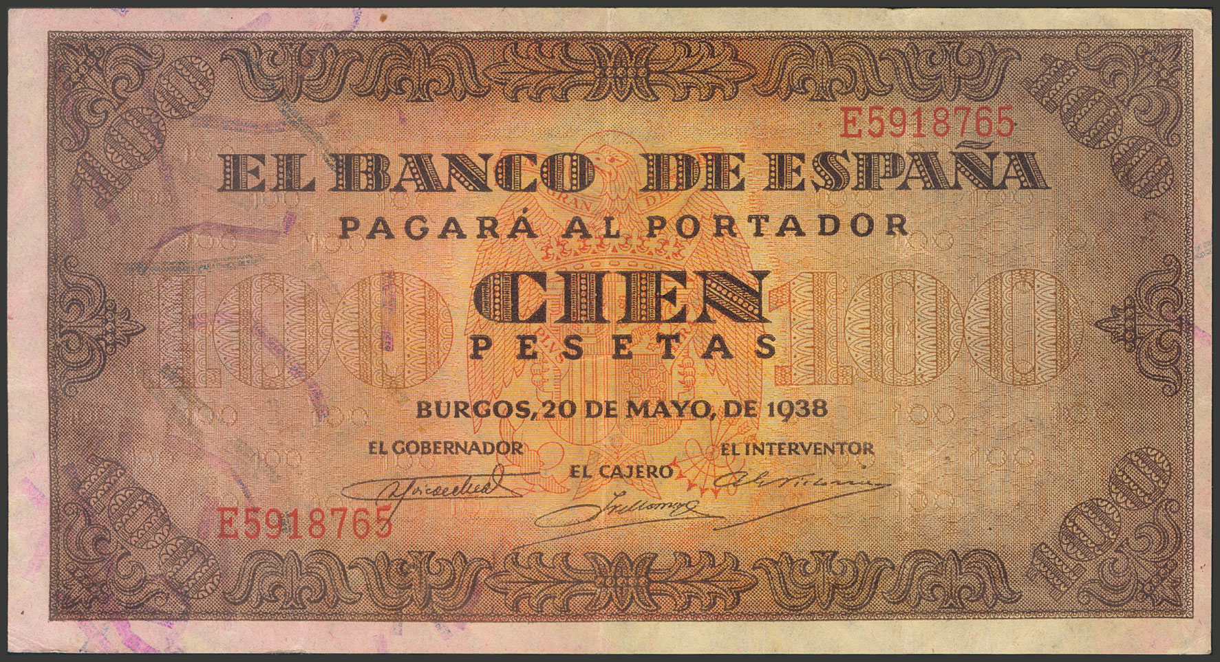100 pesetas. May 20, 1938. Series E. (Edifil 2017: 432a). Retains part of the original sizing. Extremely Fine.