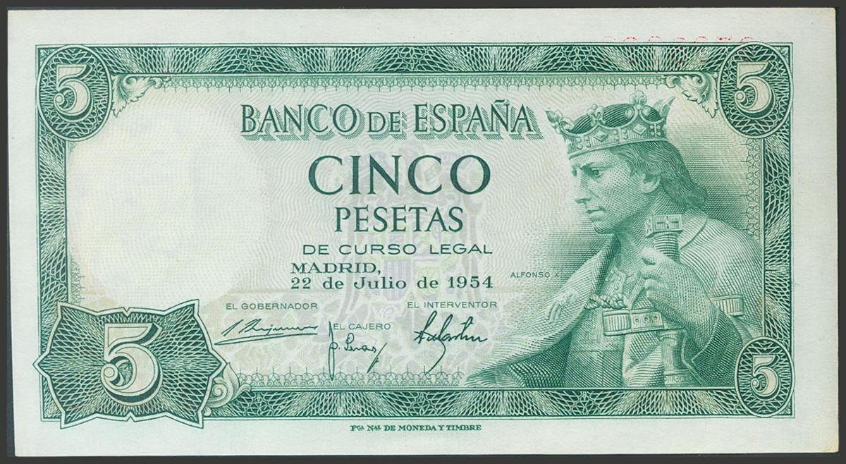 5 pesetas. July 22, 1954. No series. (Edifil 2017: 466). It retains all its original sizing. Almost Uncirculated.