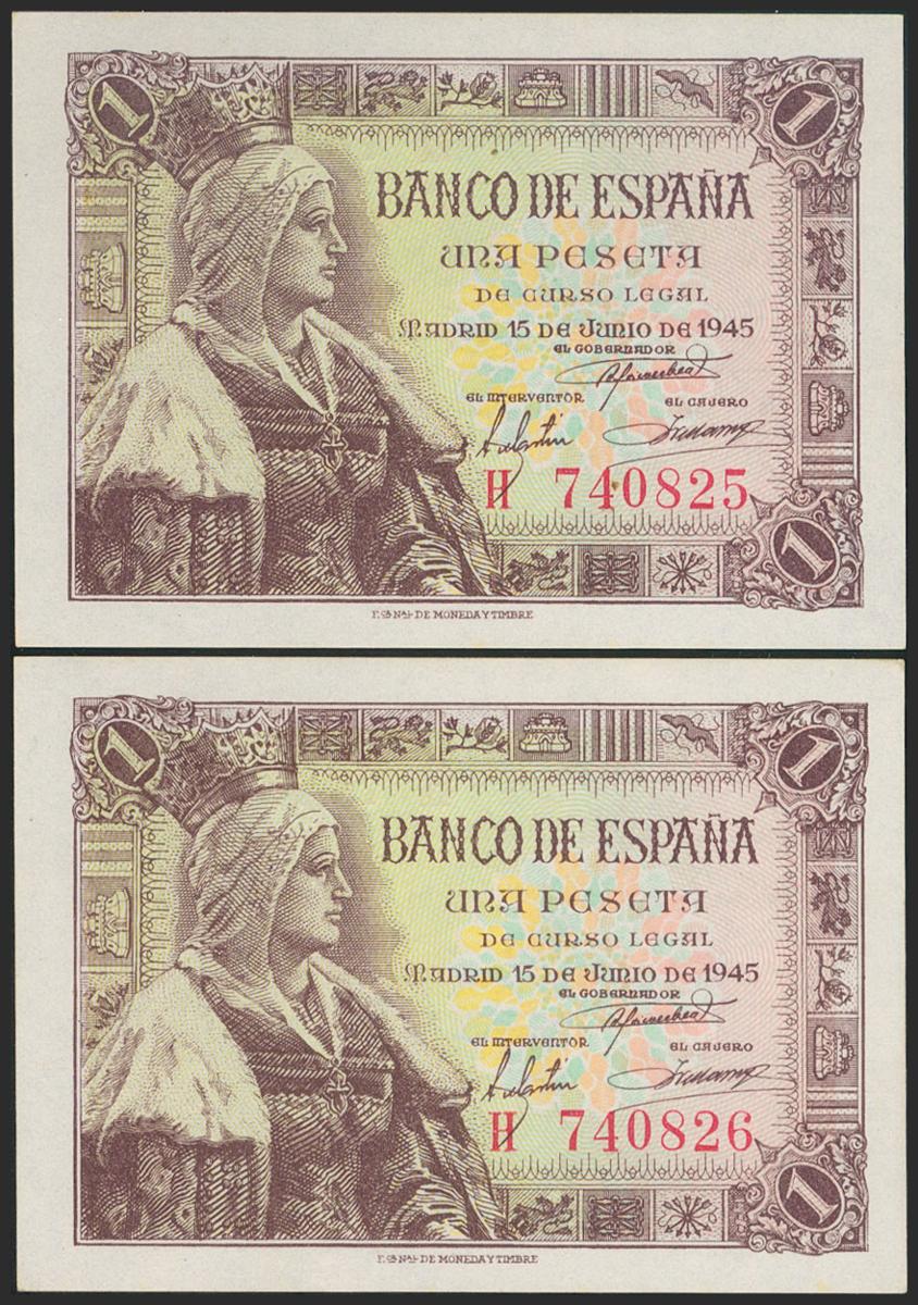 English 1 Peseta. June 15, 1945. Correlative couple. Series H. (Edifil 2021: 448a). Original sizing. Uncirculated.