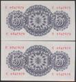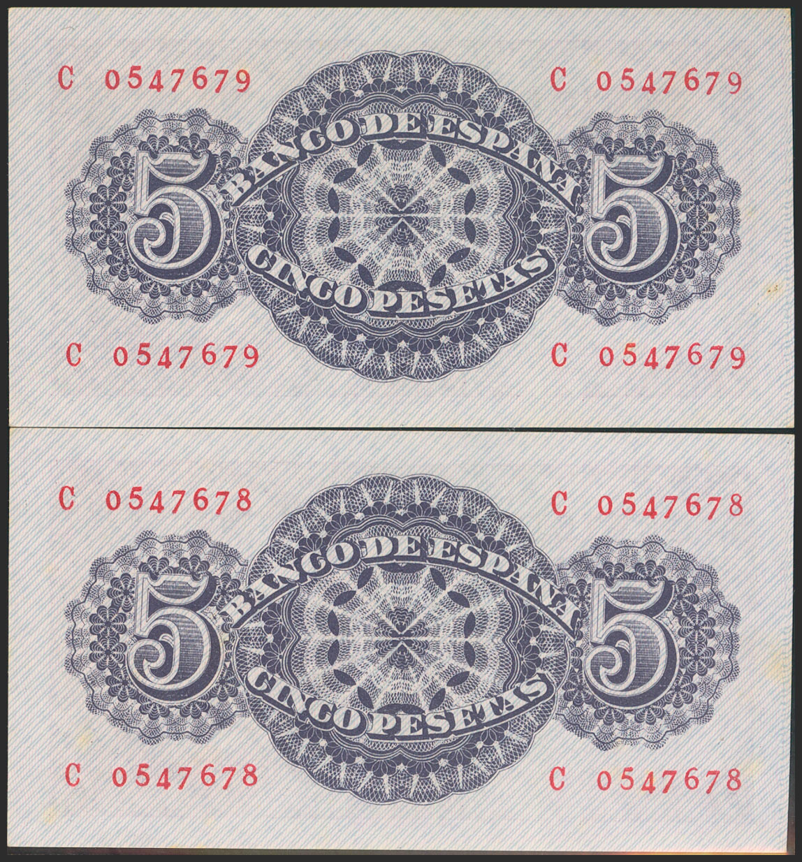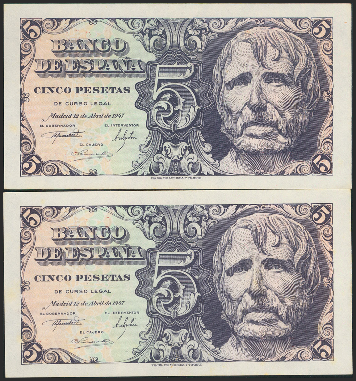 5 pesetas. April 12, 1947. Correlative couple. Series C. (Edifil 2021: 454a). Original sizing. Almost Uncirculated.