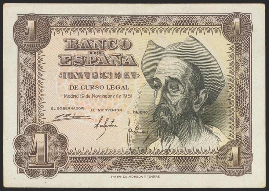 English 1 Peseta. November 19, 1951. Series Q. (Edifil 2021: 461a). Retains much of the original sizing. Good Extremely Fine.