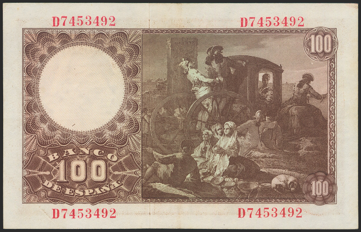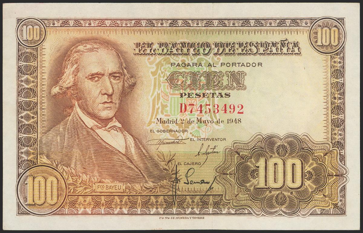 English 100 pesetas. May 2, 1948. Series D. (Edifil 2021: 456a). Retains much of the original sizing. Good Extremely Fine.