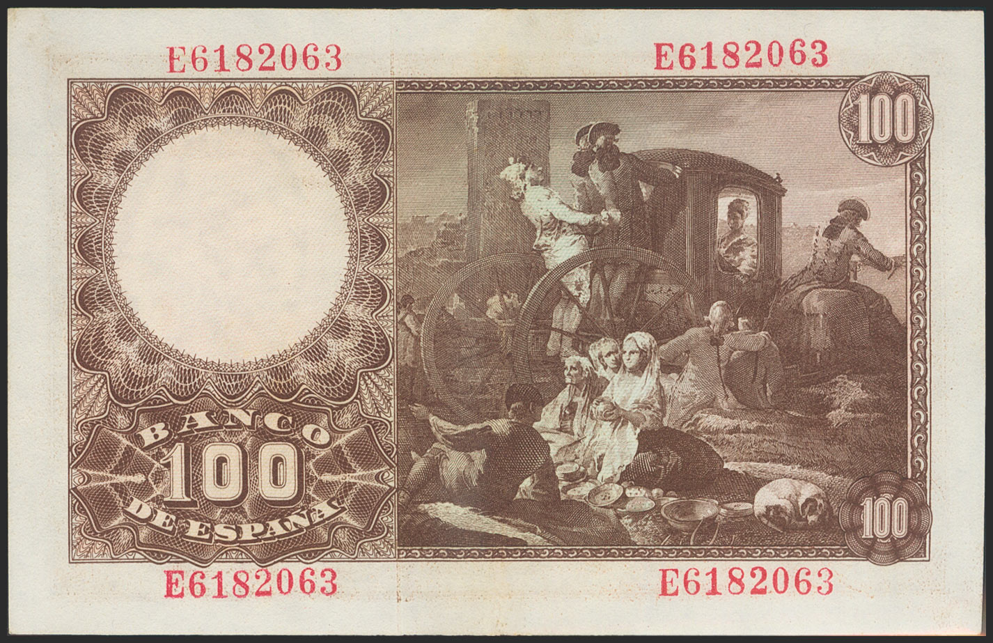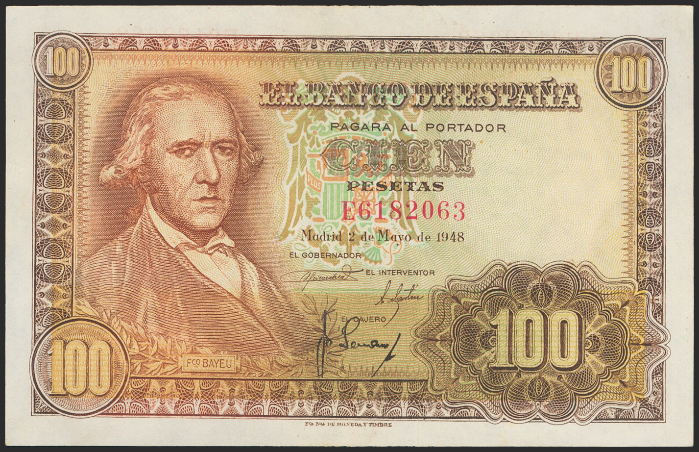 100 pesetas. May 2, 1948. Series E. (Edifil 2021: 456a). Retains much of the original sizing. Good Extremely Fine.
