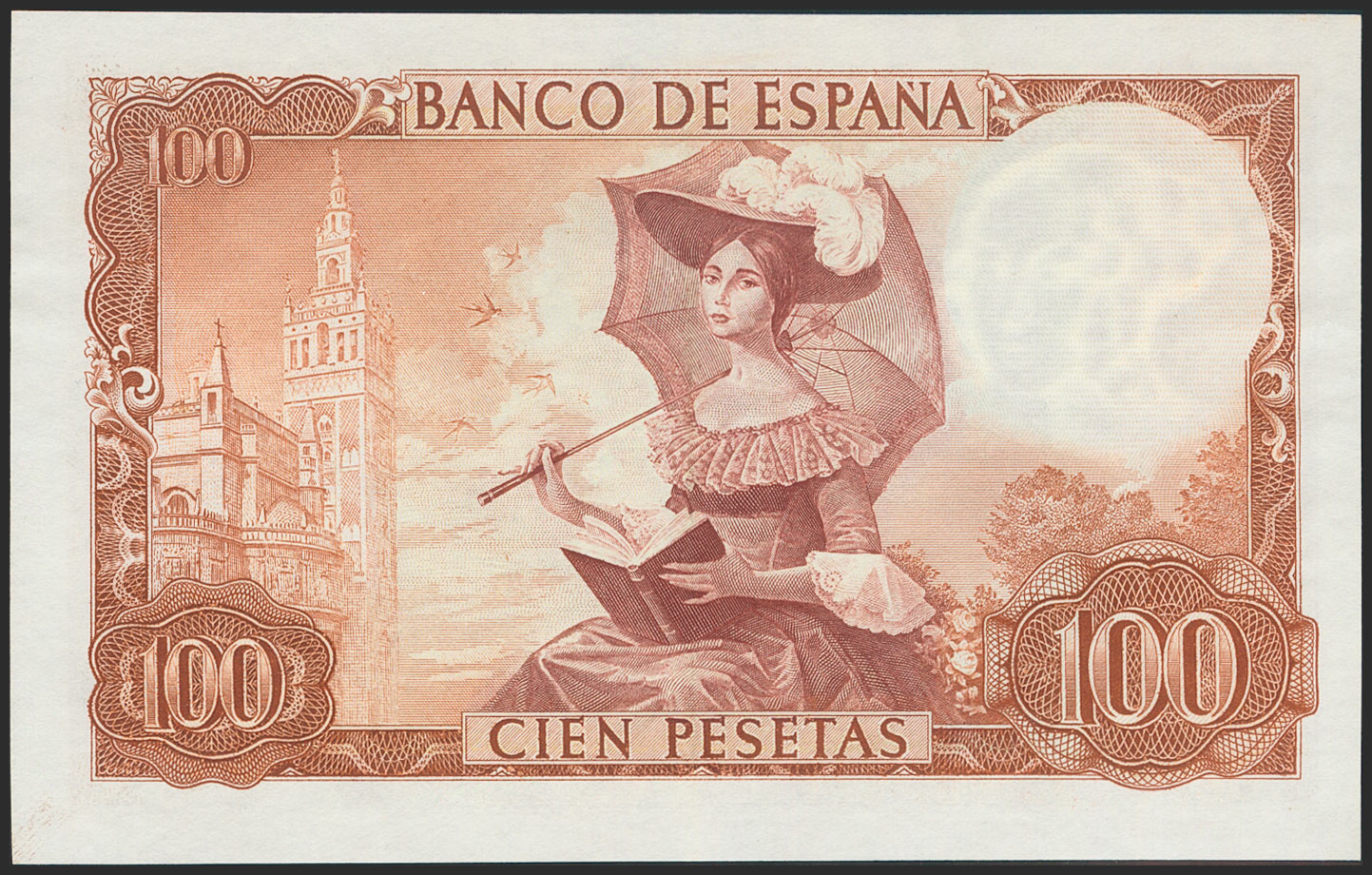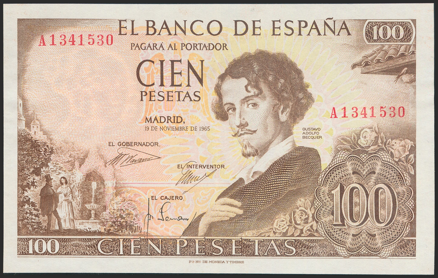 100 pesetas. November 19, 1965. Series A. (Edifil 2021: 470a). Retains much of the original sizing. Good Extremely Fine.