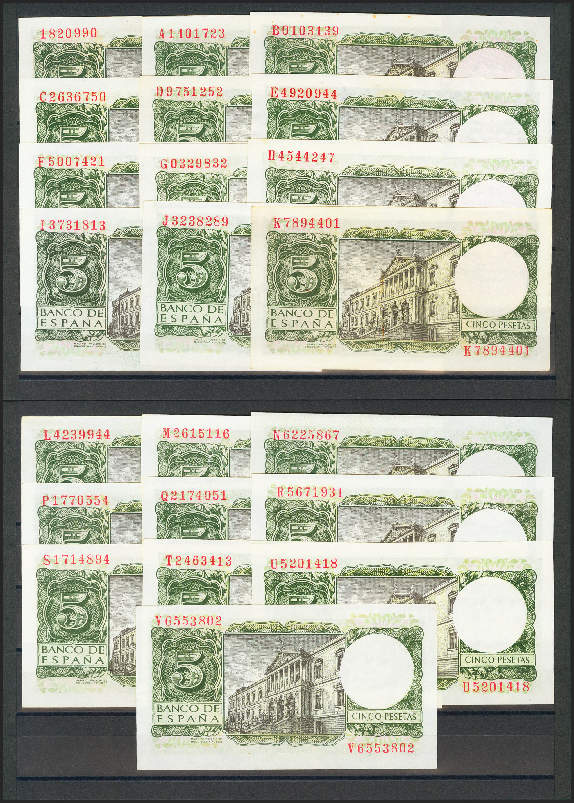 Beautiful set of 22 5 Peseta notes issued on July 22, 1954, including all the letters of the initial series, except for the W, and including the one without series. (Edifil 2021: 466, 466a). Unusual set. Uncirculated/ Almost Uncirculated (the series A Good Extremely Fine).