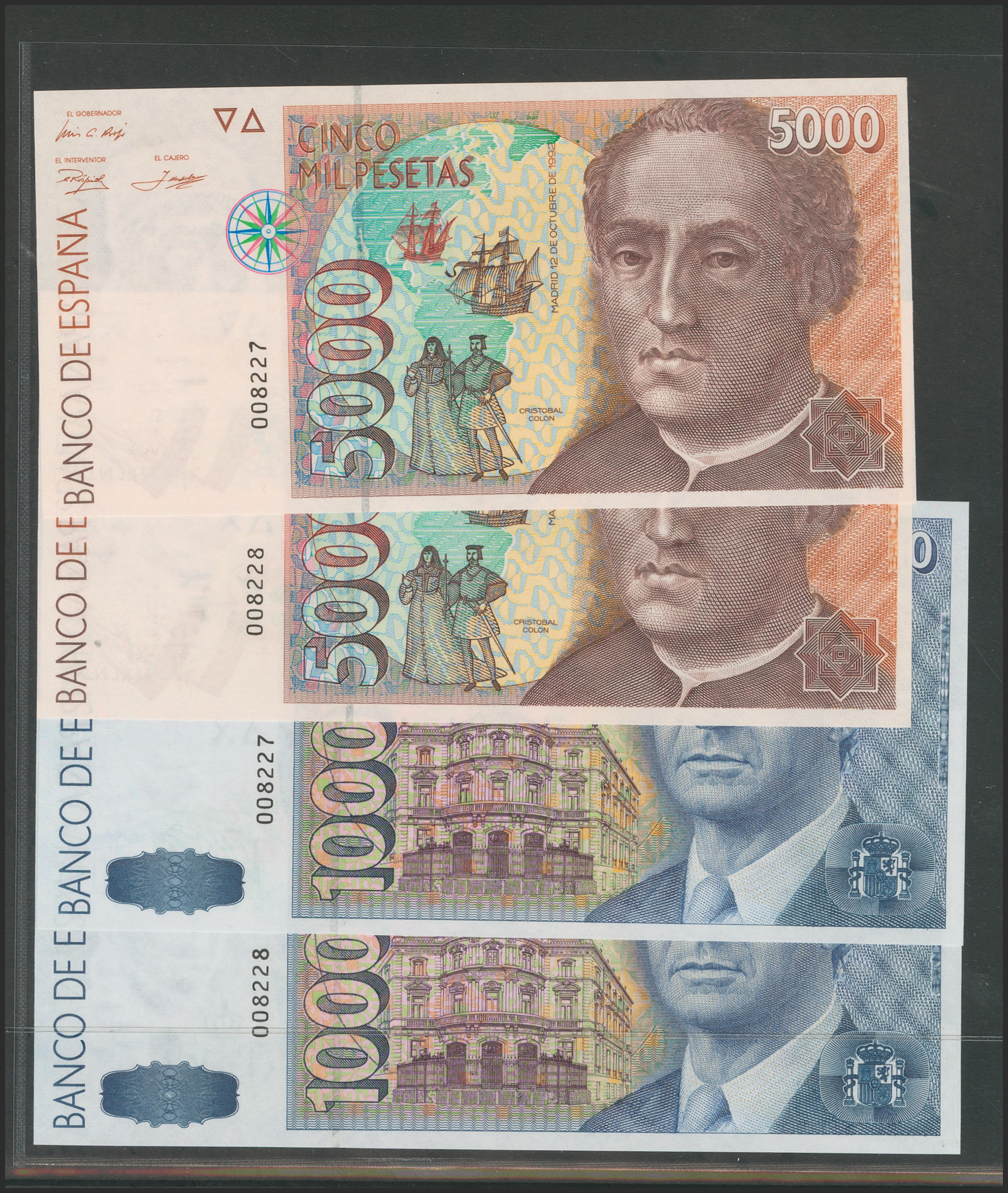Complete series of 5 banknotes from the 1992 issue (including the 2000 Pesetas from 1995 with series 1S). Correlative pair. No series and all of them with the same low numbering 008227 and 008228. (Edifil 2017: 482/85, 482A). Very rare set. Uncirculated.