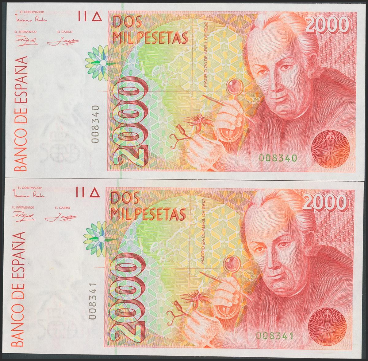 English 2000 Pesetas. April 24, 1992. Correlative couple. No series and low numbering. (Edifil 2017: 482). Uncirculated.