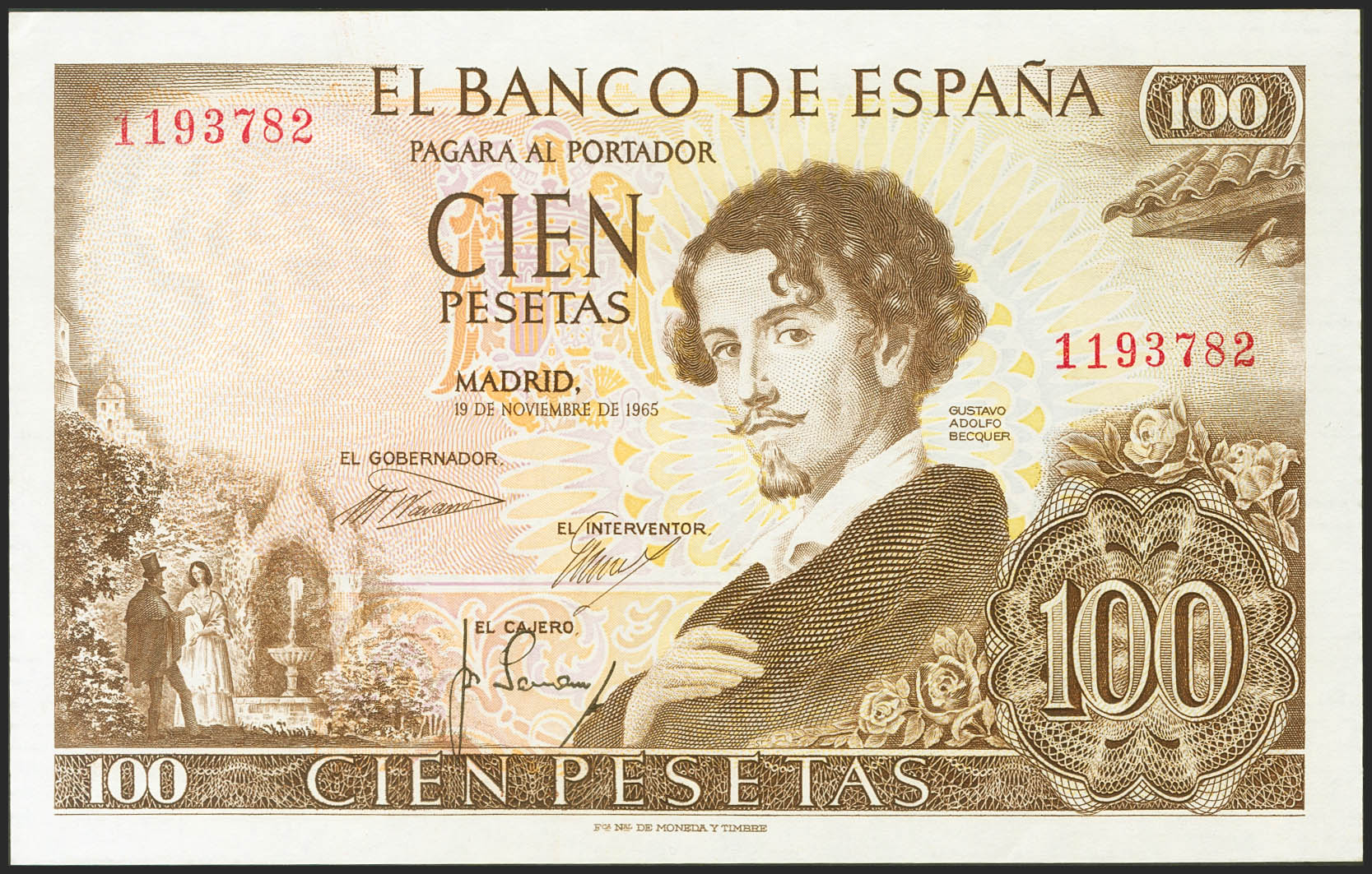 100 pesetas. November 19, 1965. No series. (Edifil 2017: 470). Original sizing. Almost Uncirculated.
