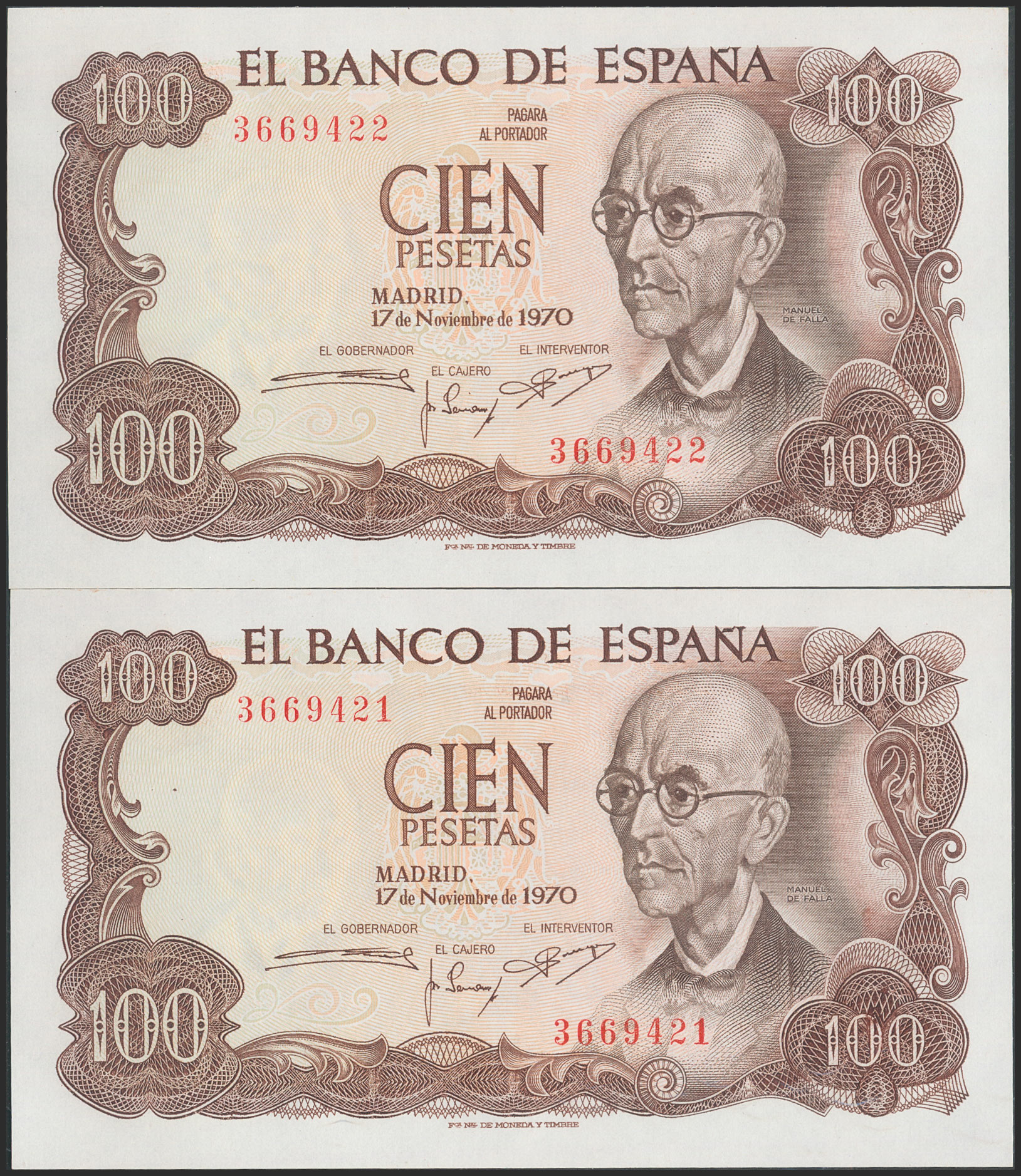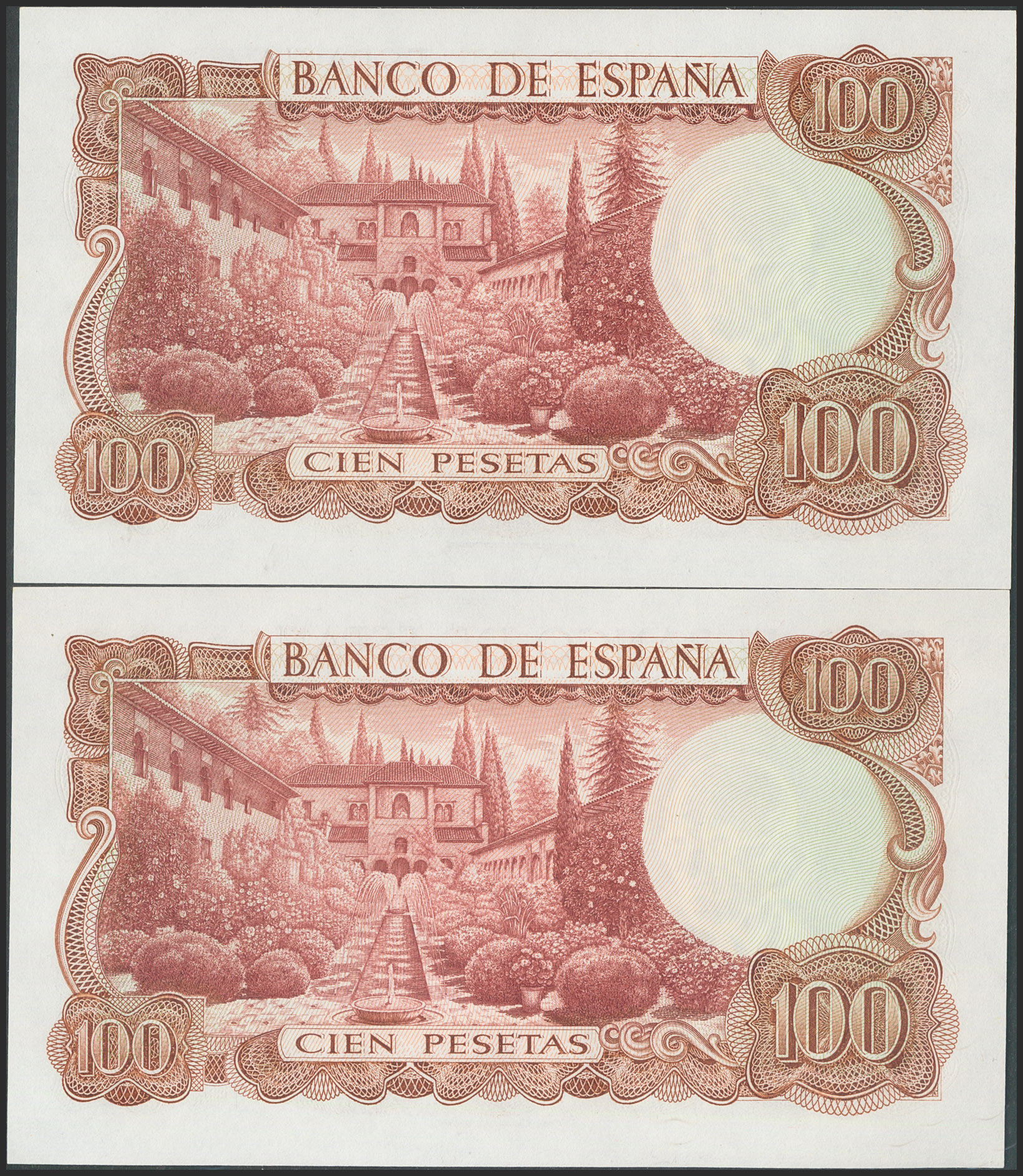 English 100 Pesetas. November 17, 1970. Consecutive pair. No series. (Edifil 2017: 472). Original finish. Uncirculated.