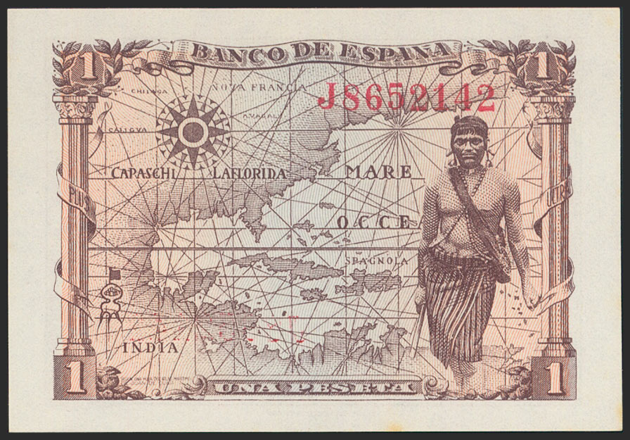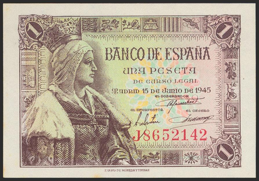 English 1 Peseta. June 15, 1945. Series J. (Edifil 2021: 448a). Original sizing and dots. Almost Uncirculated.