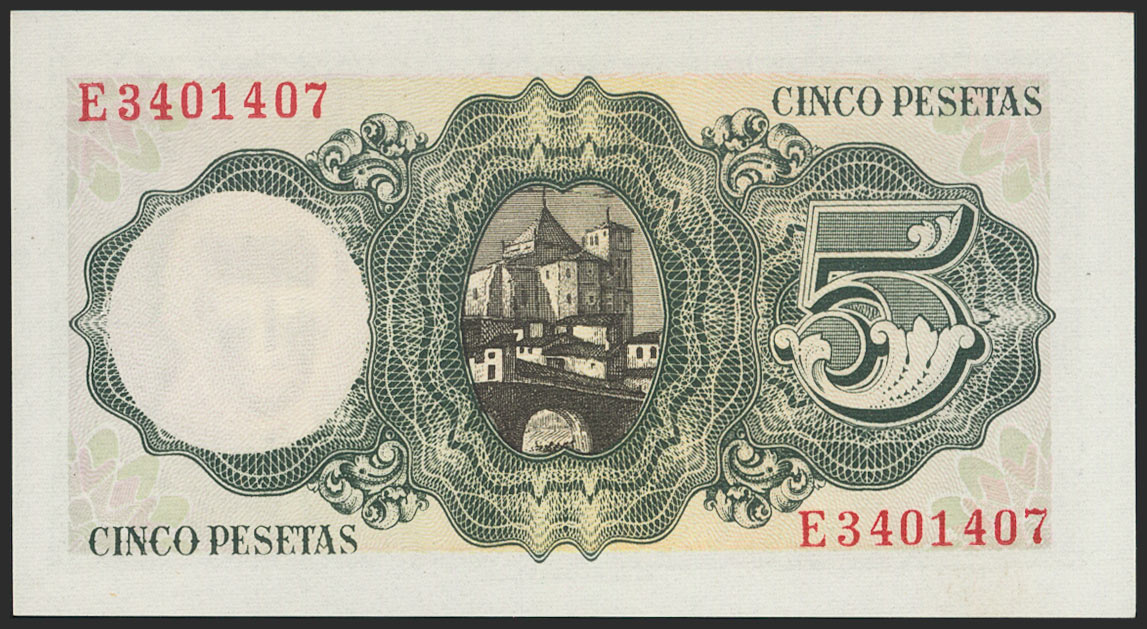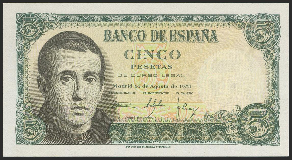5 pesetas. August 16, 1951. Series E. (Edifil 2021: 459a). Original sizing. Uncirculated.