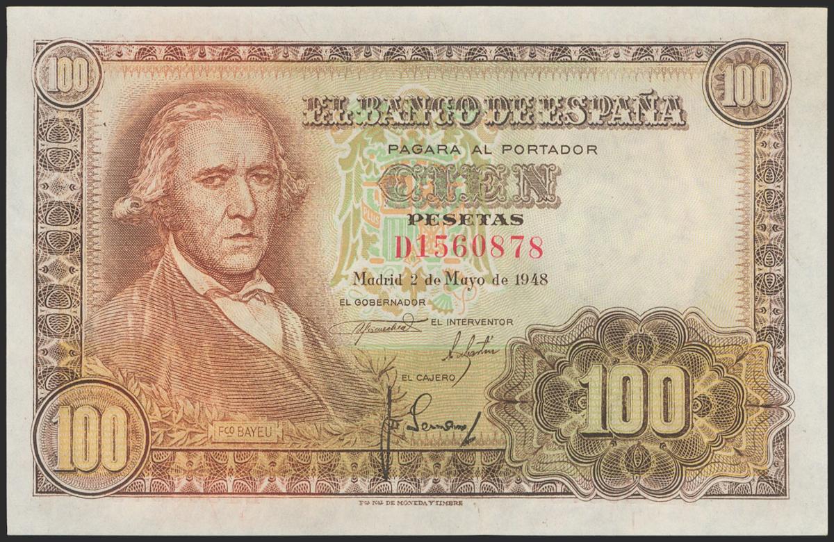 100 pesetas. May 2, 1948. Series D. (Edifil 2021: 456a). Retains much of the original sizing. EBC++.