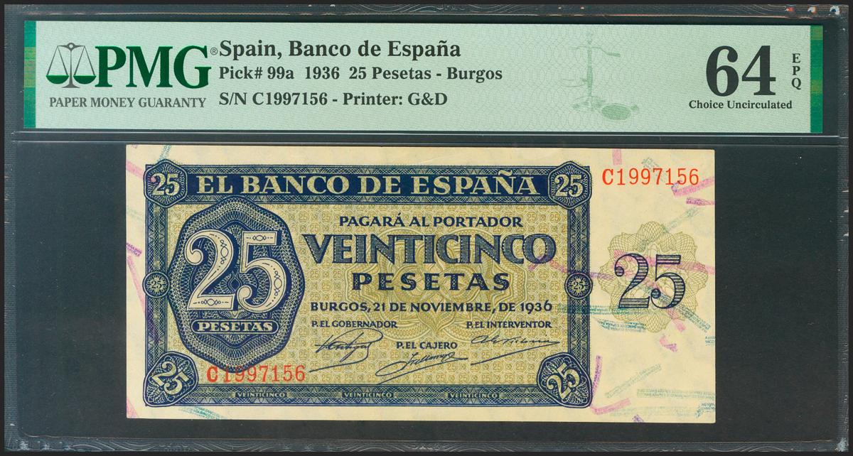 25 pesetas. November 21, 1936. Series C. (Edifil 2021: 419a, Pick: 99a). Rare in this quality. Uncirculated. PMG64EPQ package.