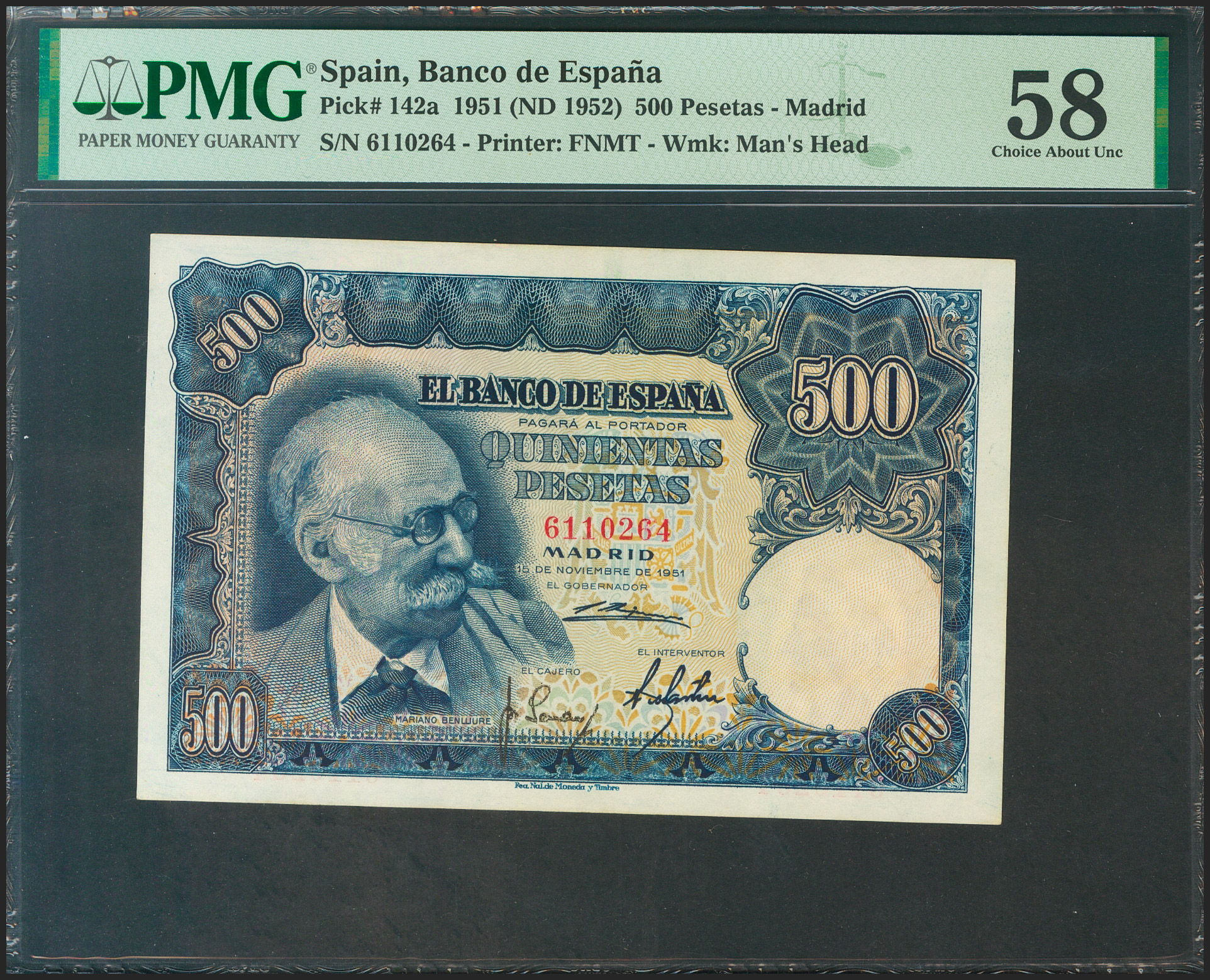 500 pesetas. November 15, 1951. No series. (Edifil 2021: 460a, Pick: 142a). Unusual in this quality. EBC++. PMG58 encapsulation.