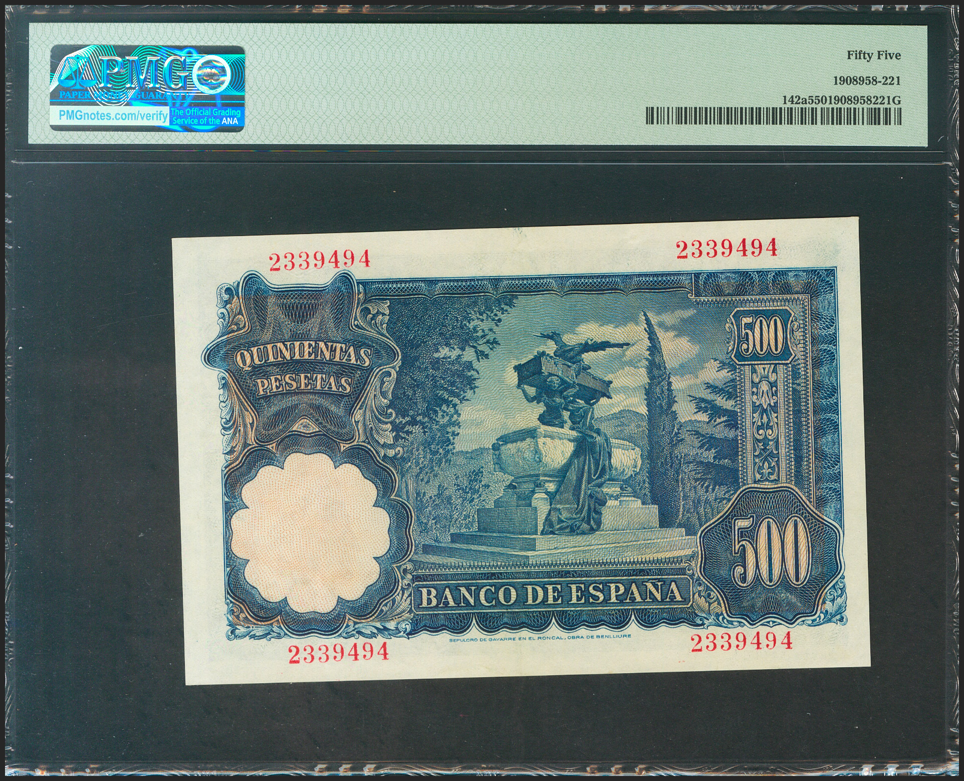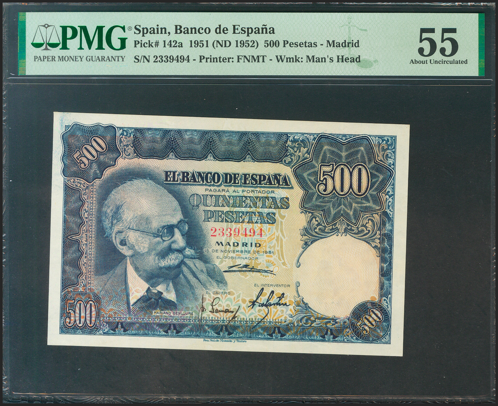 English 500 pesetas. November 15, 1951. No series. (Edifil 2021: 460a, Pick: 142a). Good Extremely Fine. PMG55 encapsulation.