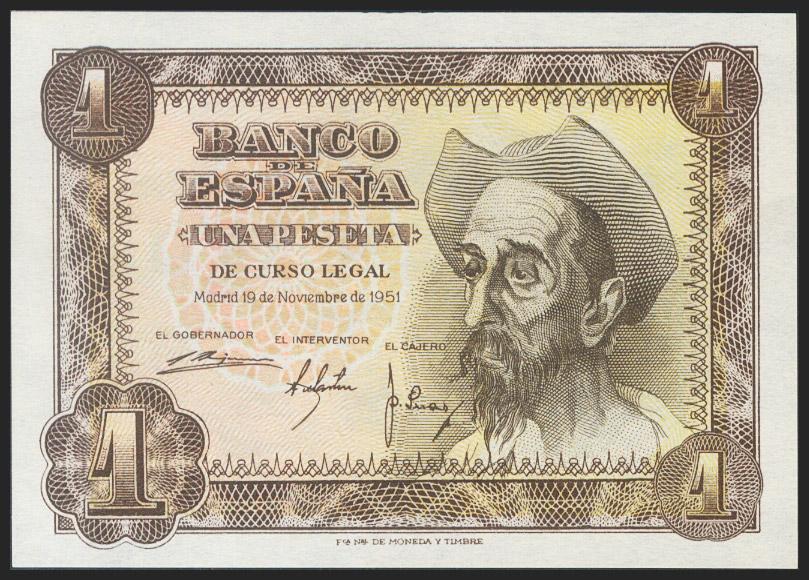 English 1 Peseta. November 19, 1951. Series P and capicúa numbering. (Edifil 2021: 461a). Original sizing. Uncirculated.