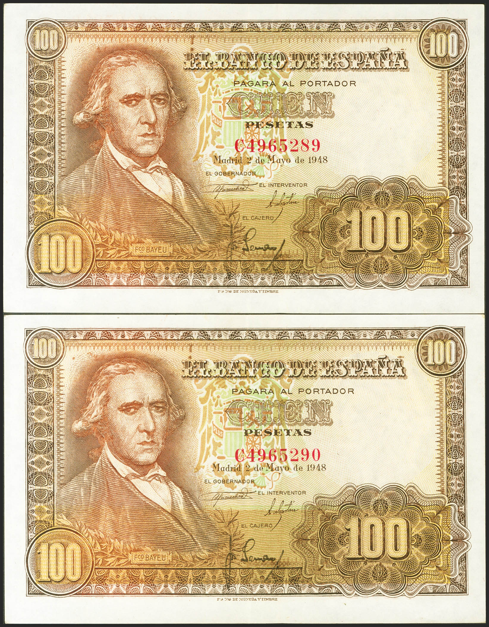 100 pesetas. May 2, 1948. Correlative couple. Series C. (Edifil 2021: 456a). Retains much of the original sizing. Good Extremely Fine.