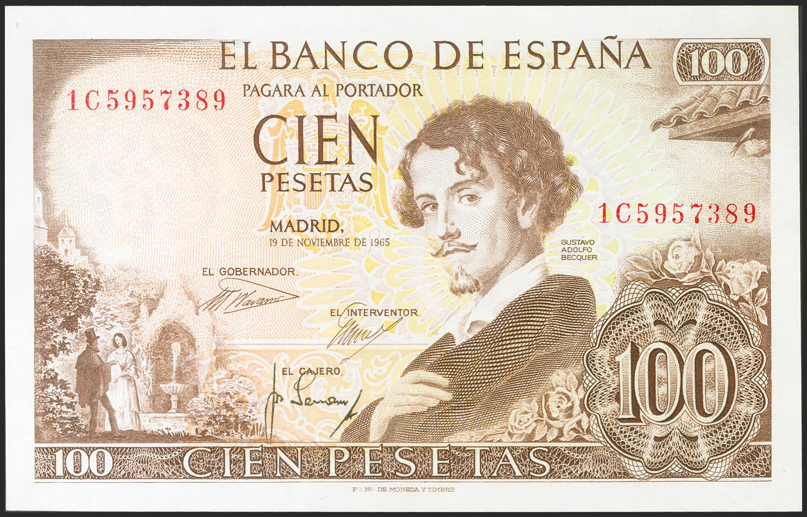 100 pesetas. November 19, 1965. Series 1C. (Edifil 2021: 470a). It retains all its original sizing. Uncirculated.